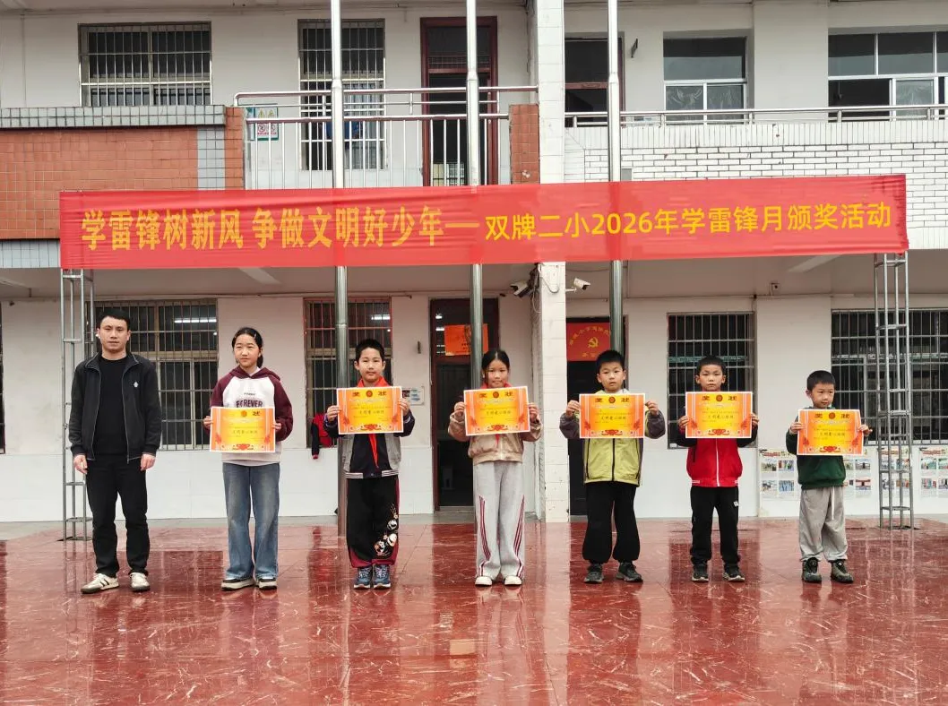 4月7日上午,双牌二小举行“学雷锋树新风 争做文明好少年”颁奖活动,对学雷锋月中表现优秀的集体和个人进行表彰。学校为“班级小雷锋”“学雷锋先进个人”“文明爱心班级”等获奖代表颁奖,以实际行动传承雷锋精神。(曾杨郭青玲 潘婷