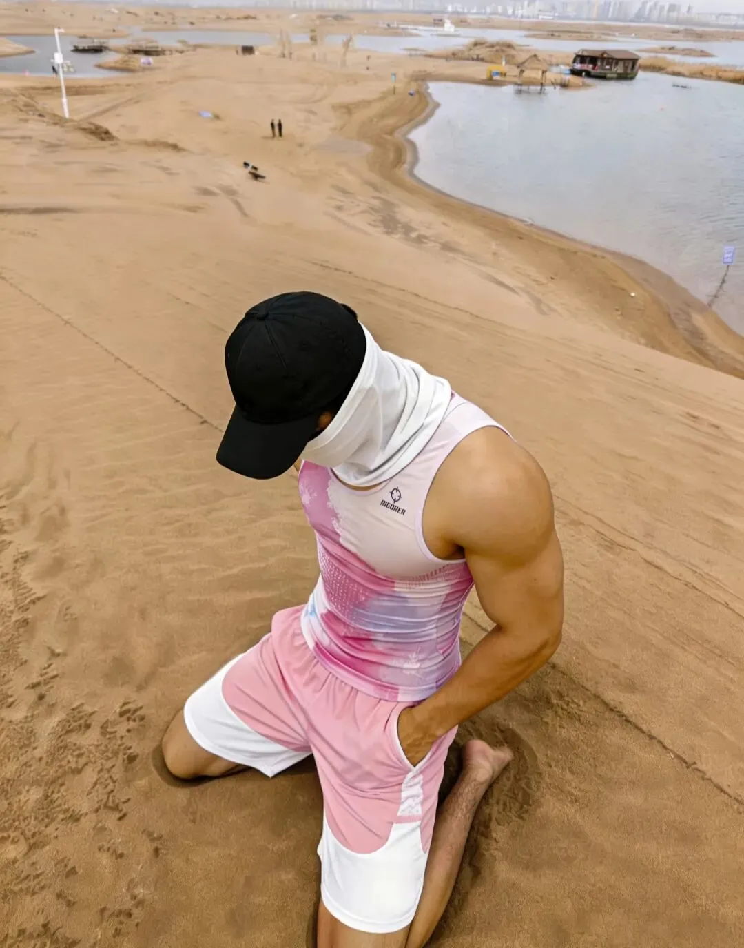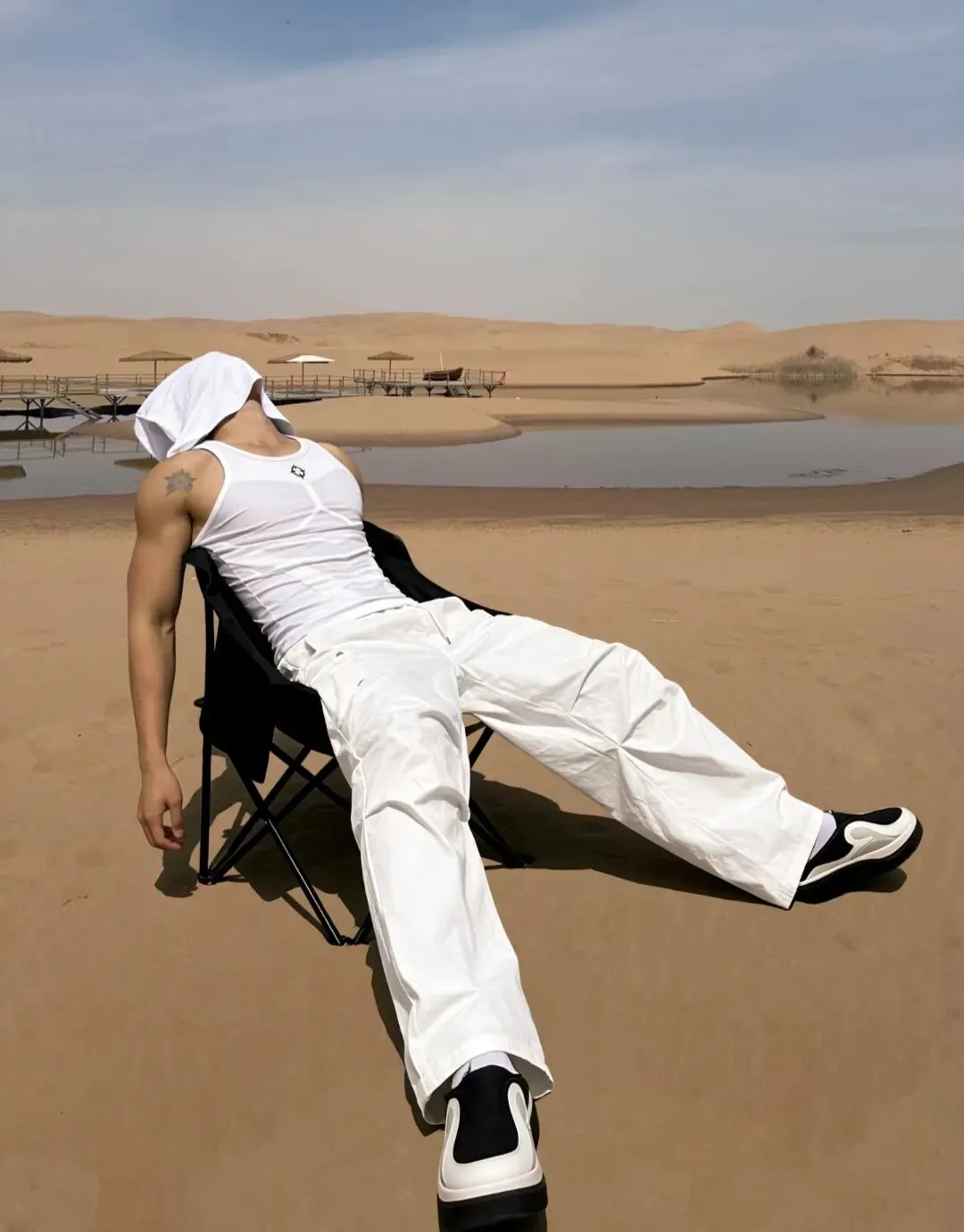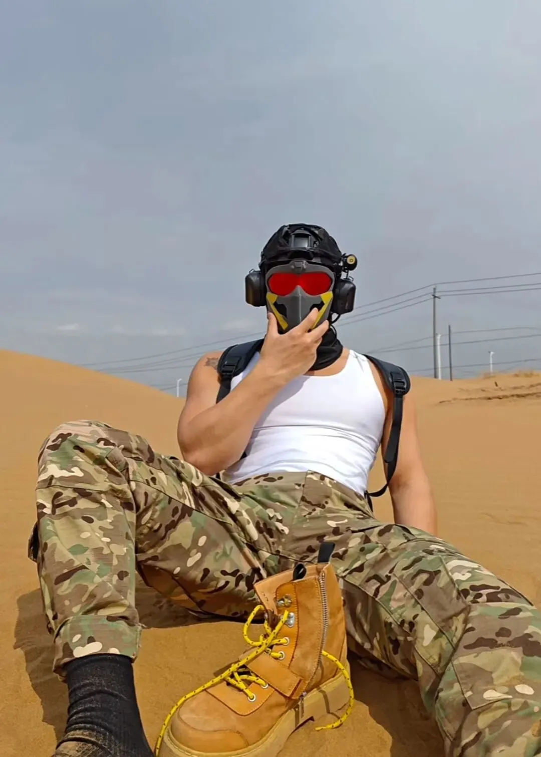 宽松的裤型被他的大腿肌肉撑得满满当当,裤脚随意挽起,露出古铜色的小腿,肌肉线条流畅有力,脚踝上沾着一点沙漠的细沙,带着点不羁的野性。每次他迈步走在沙漠里,迷彩裤会随着动作轻轻摆动,大腿肌肉的轮廓若隐若现,那种充满力量感的姿态,比任何时尚大片都撩人。