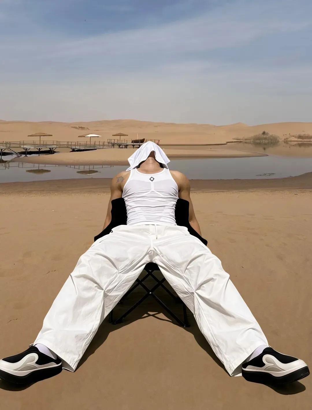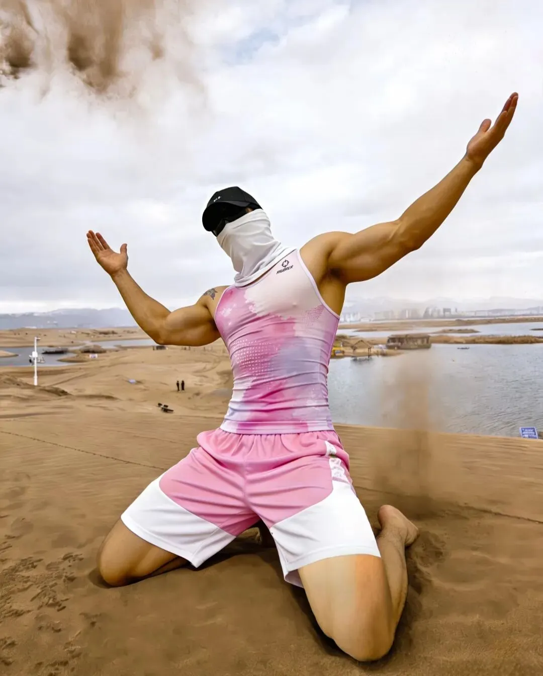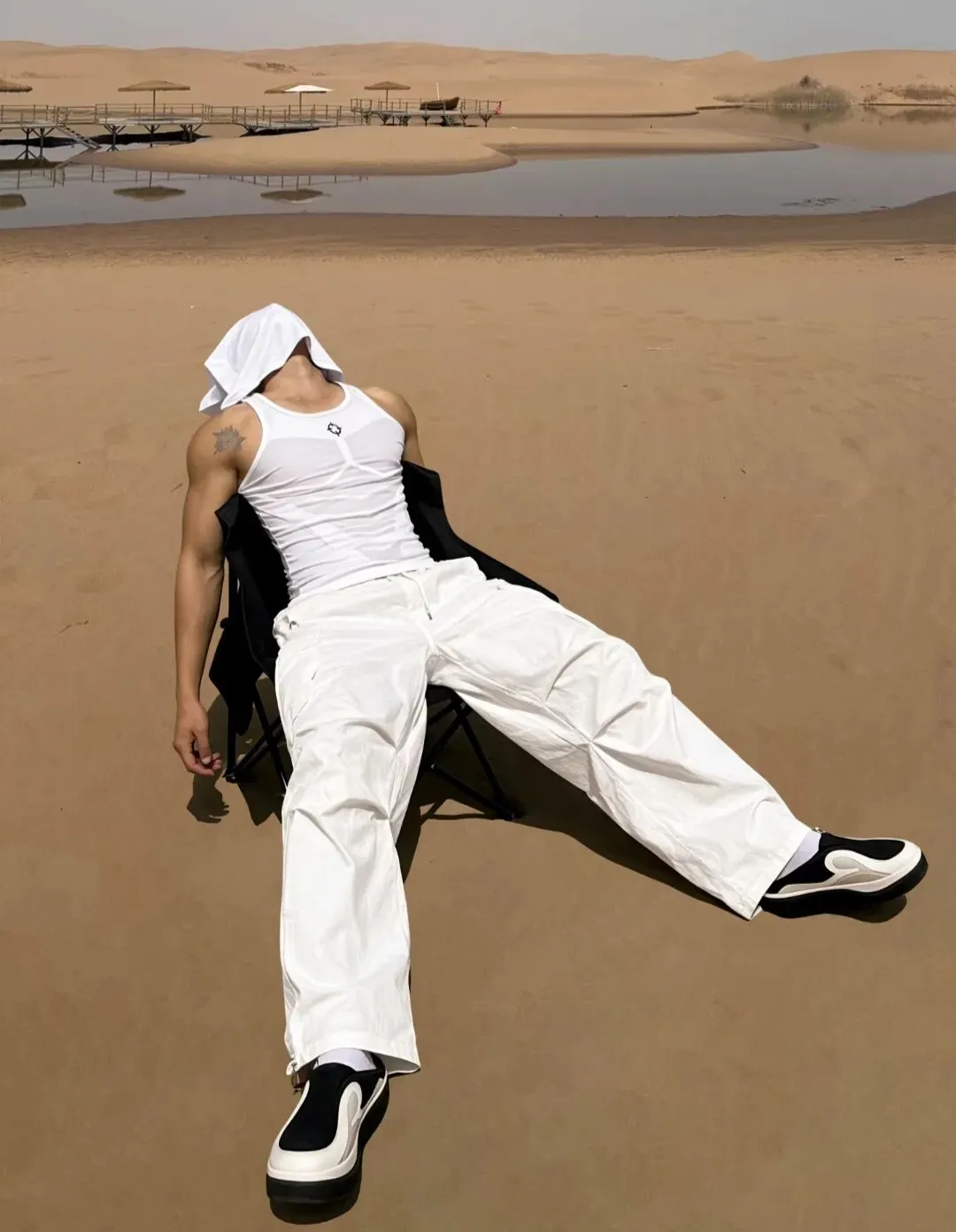 宽松的裤型被他的大腿肌肉撑得满满当当,裤脚随意挽起,露出古铜色的小腿,肌肉线条流畅有力,脚踝上沾着一点沙漠的细沙,带着点不羁的野性。每次他迈步走在沙漠里,迷彩裤会随着动作轻轻摆动,大腿肌肉的轮廓若隐若现,那种充满力量感的姿态,比任何时尚大片都撩人。