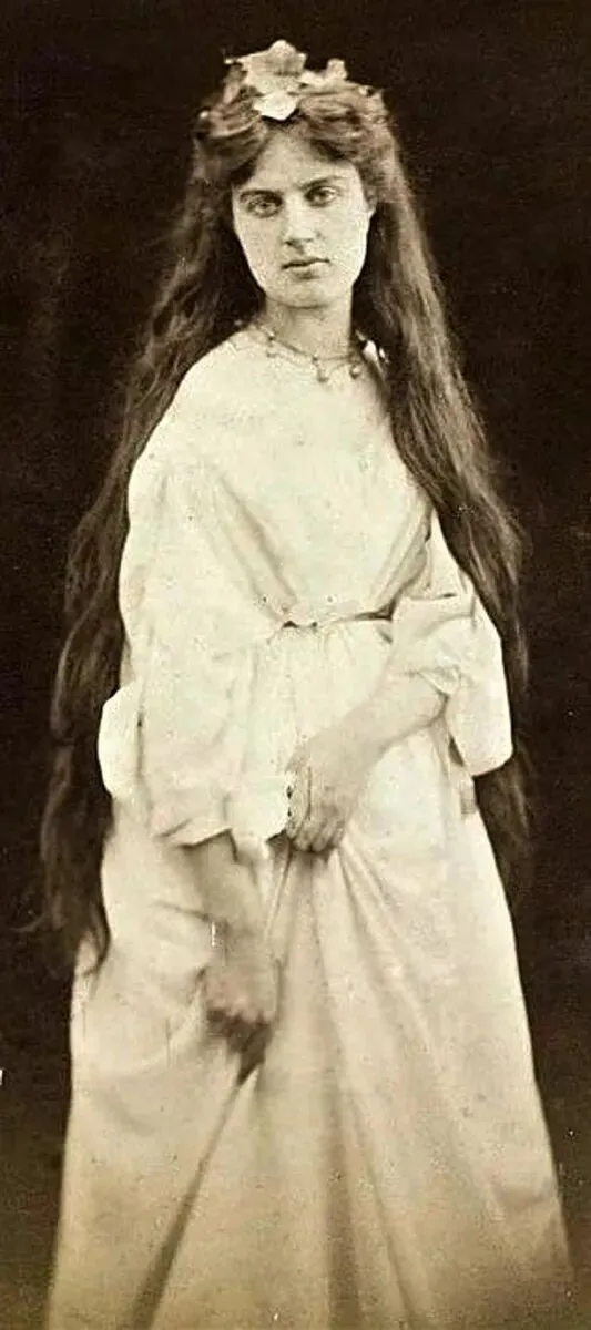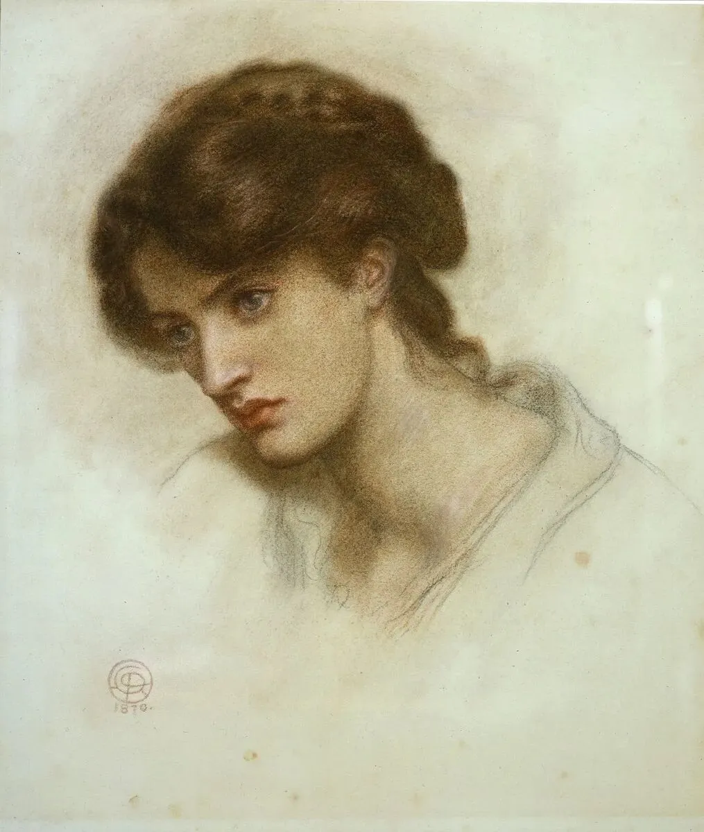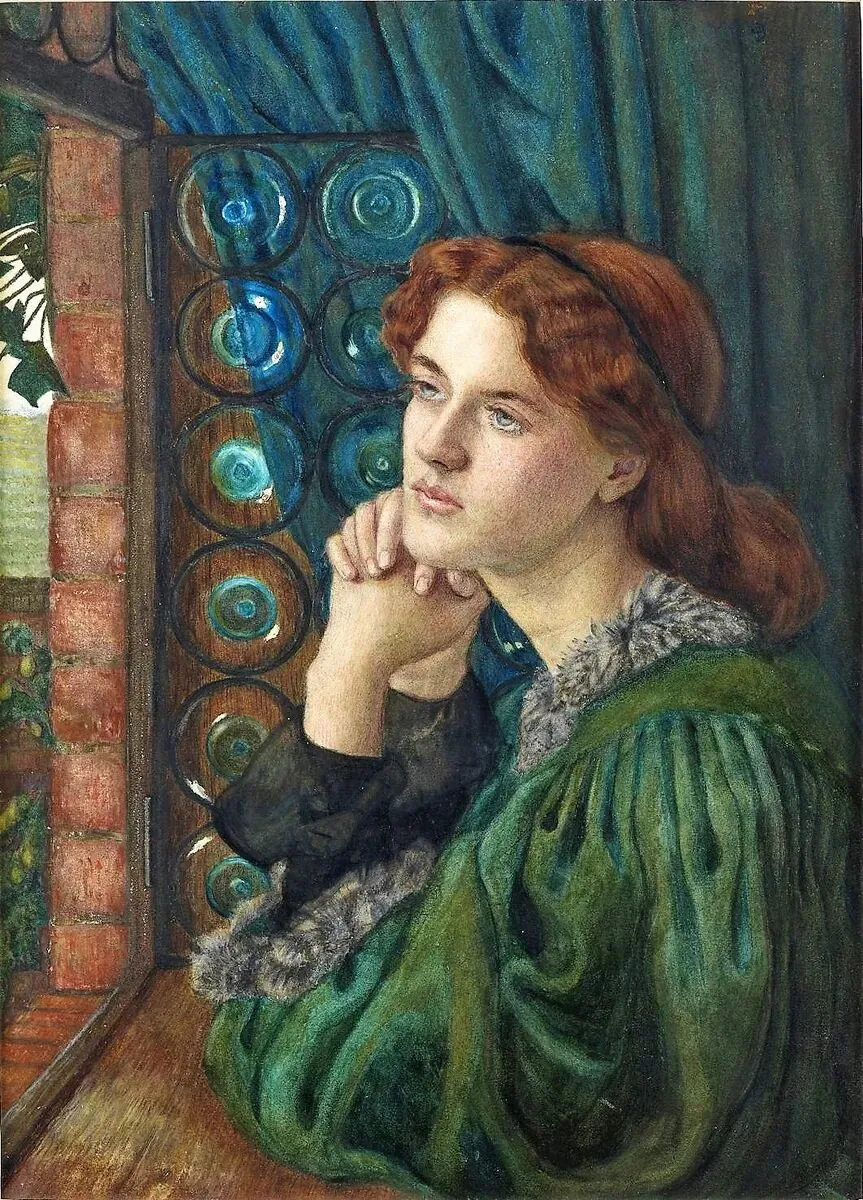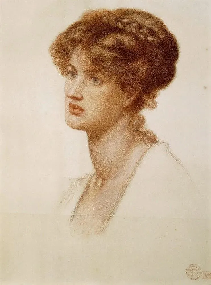 这位美人面容严肃,未绽放过笑意,她身着黑衣,曾为拉斐尔派画家担任模特,她本人也创作绘画作品。