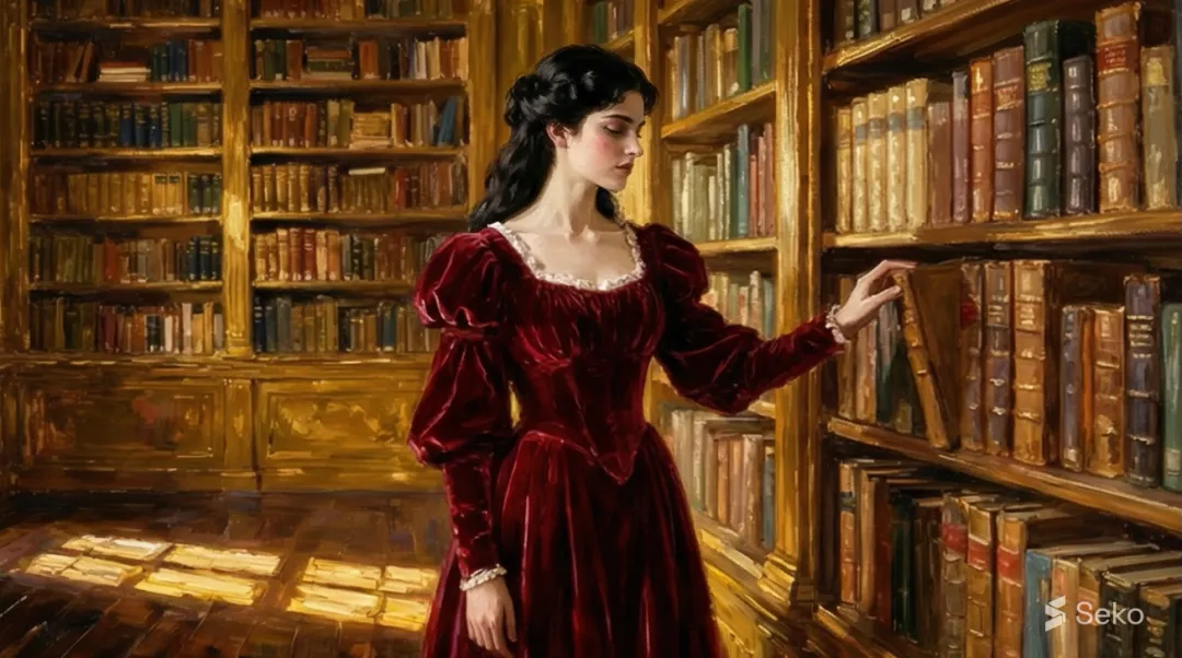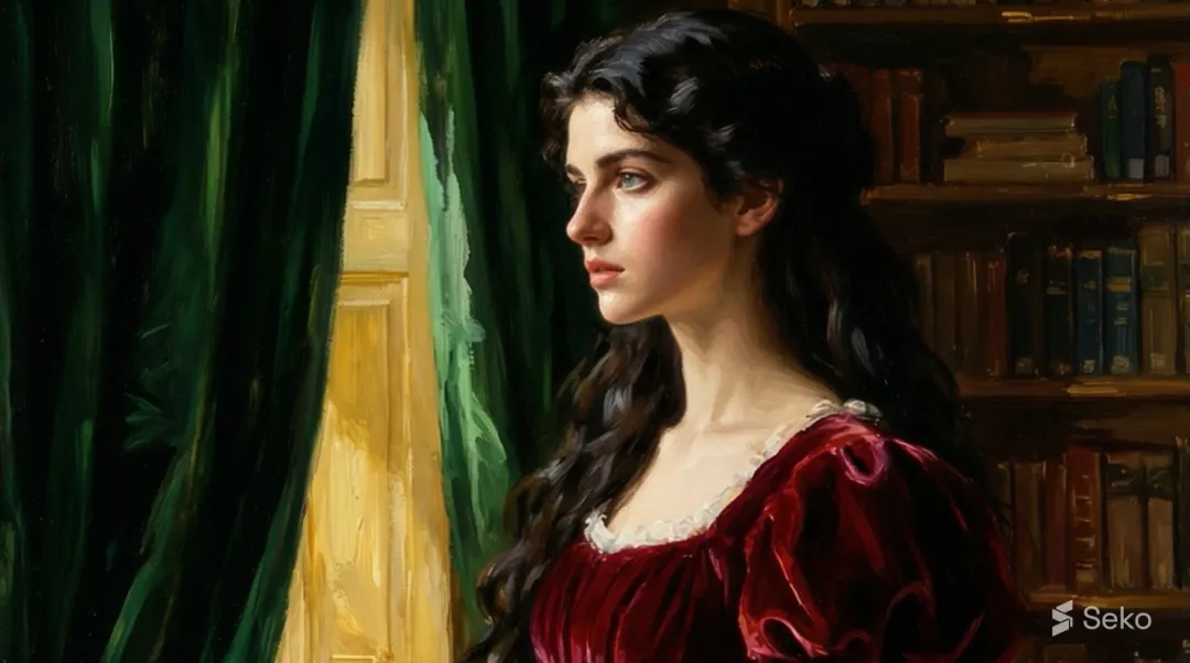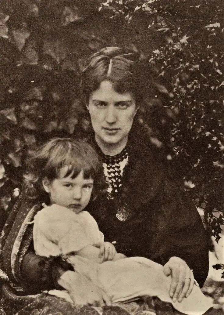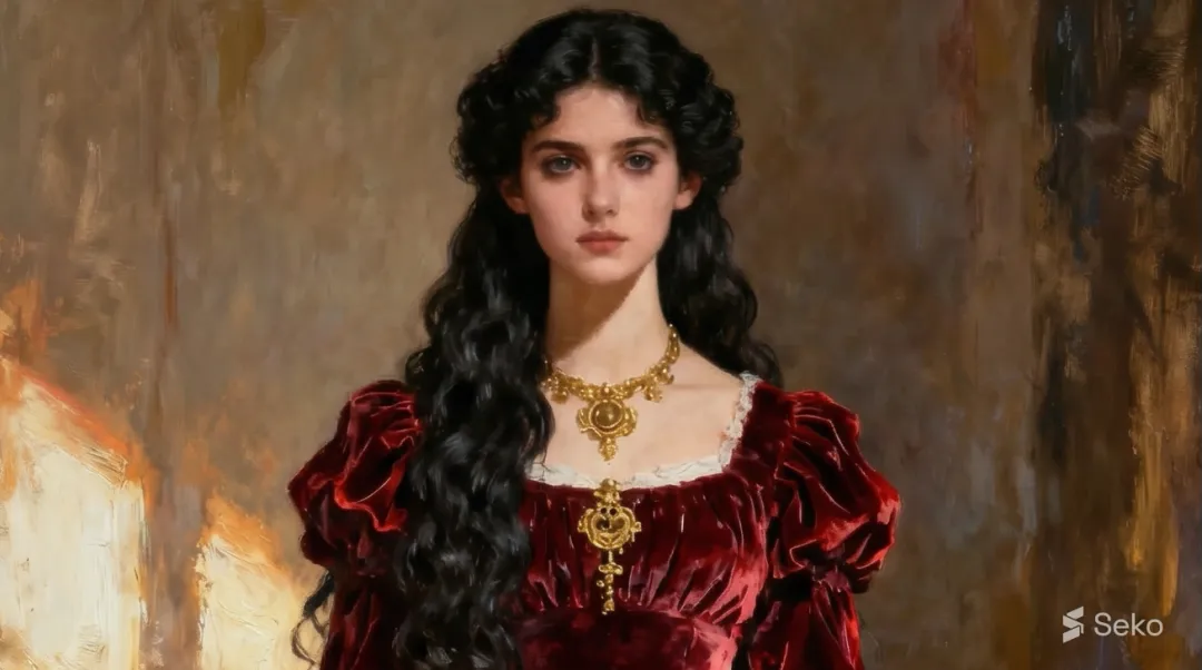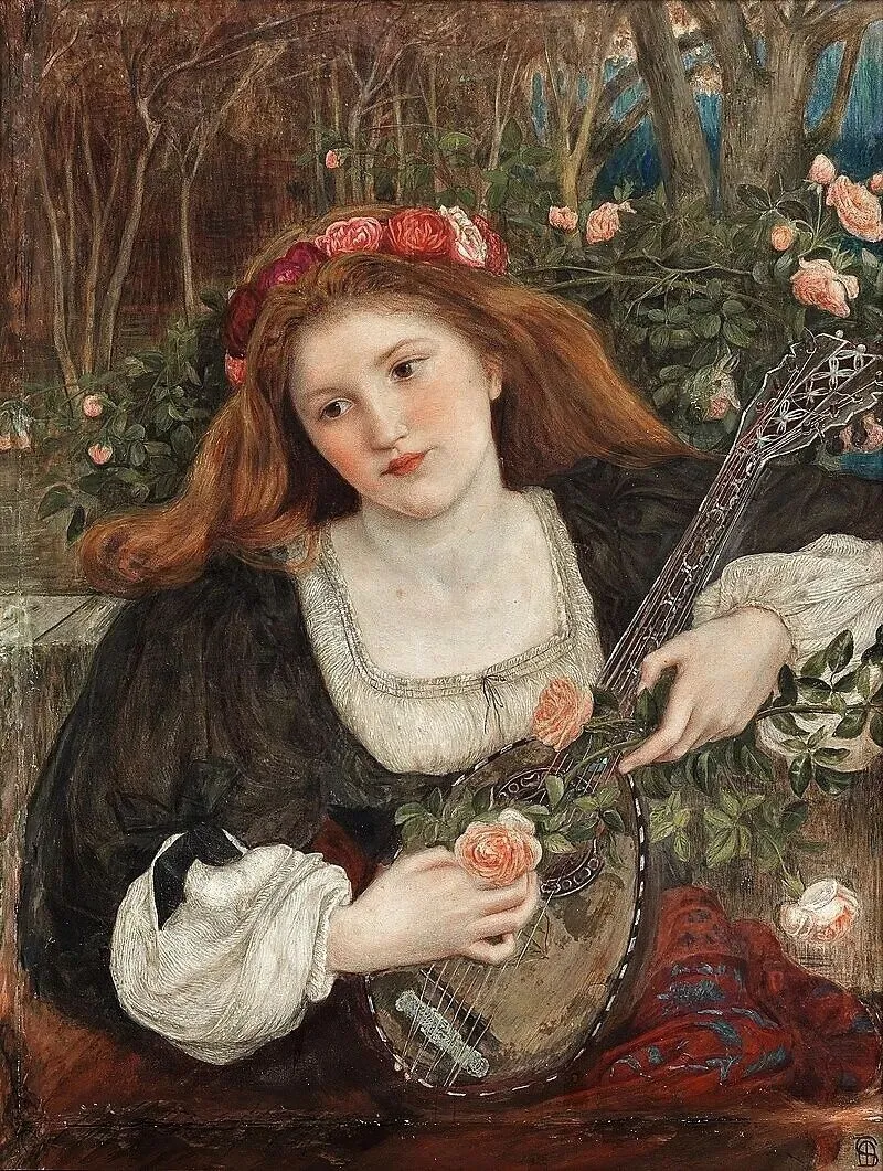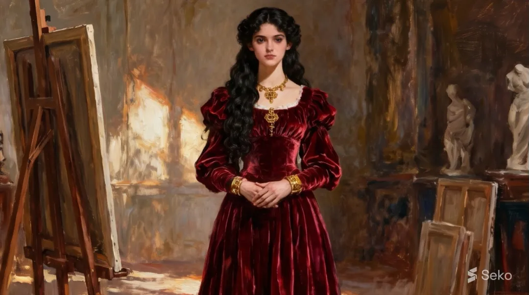 这位美人面容严肃,未绽放过笑意,她身着黑衣,曾为拉斐尔派画家担任模特,她本人也创作绘画作品。