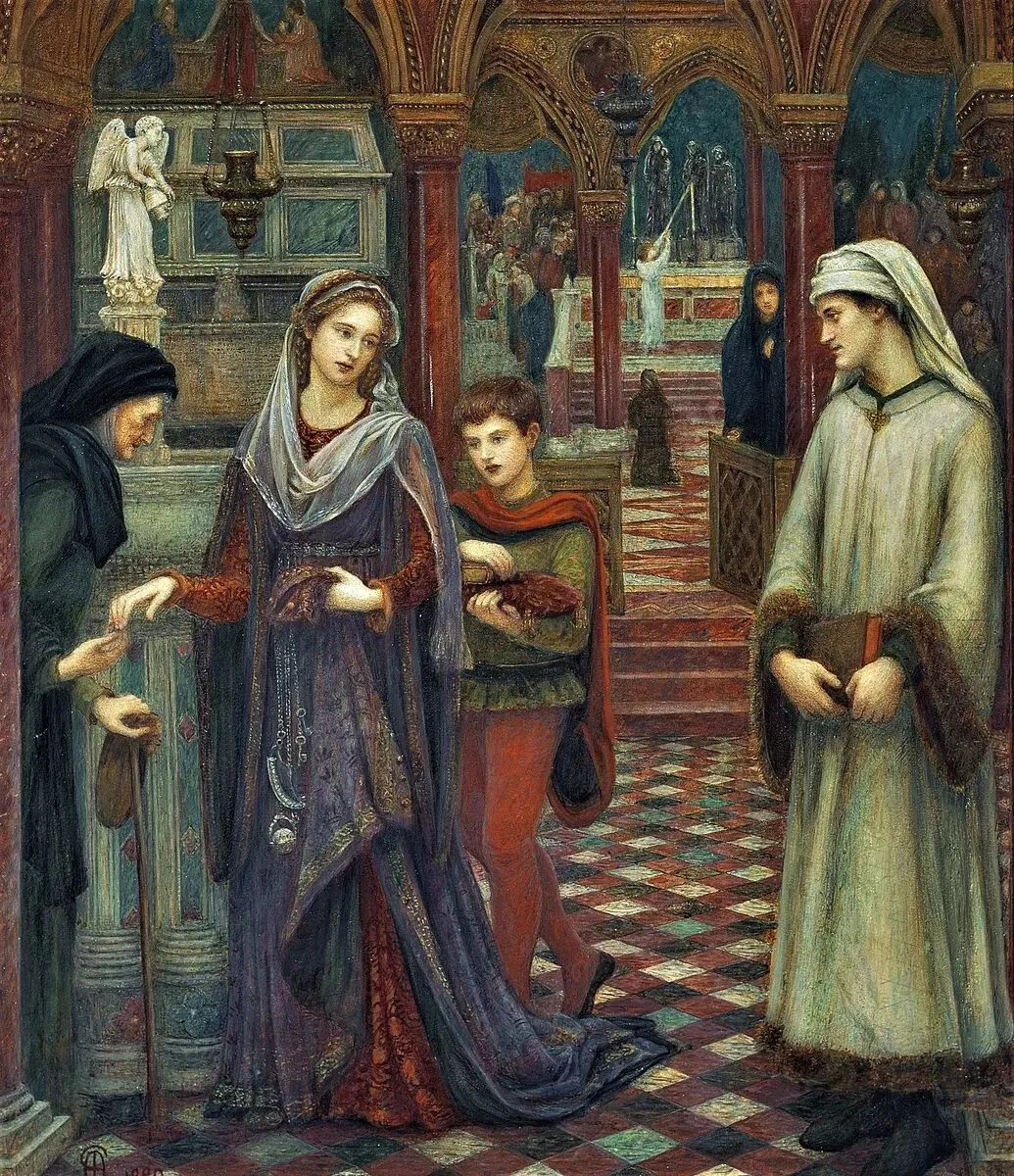 玛丽·斯帕塔利-斯蒂尔曼的画作《彼特拉克与劳拉在圣克利尔的初次相遇》,1889年。新画廊,伦敦