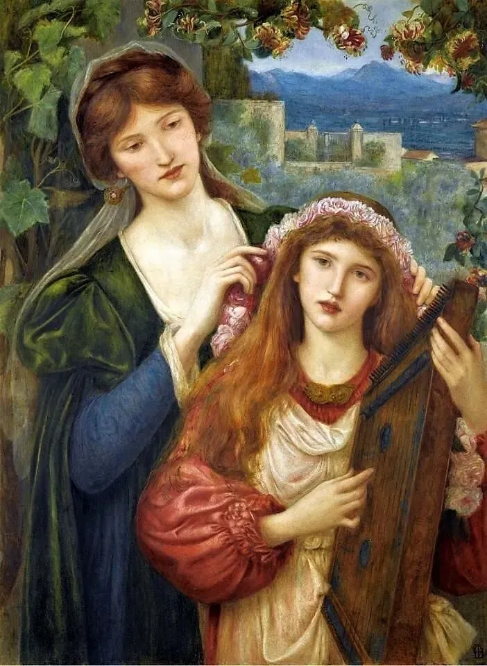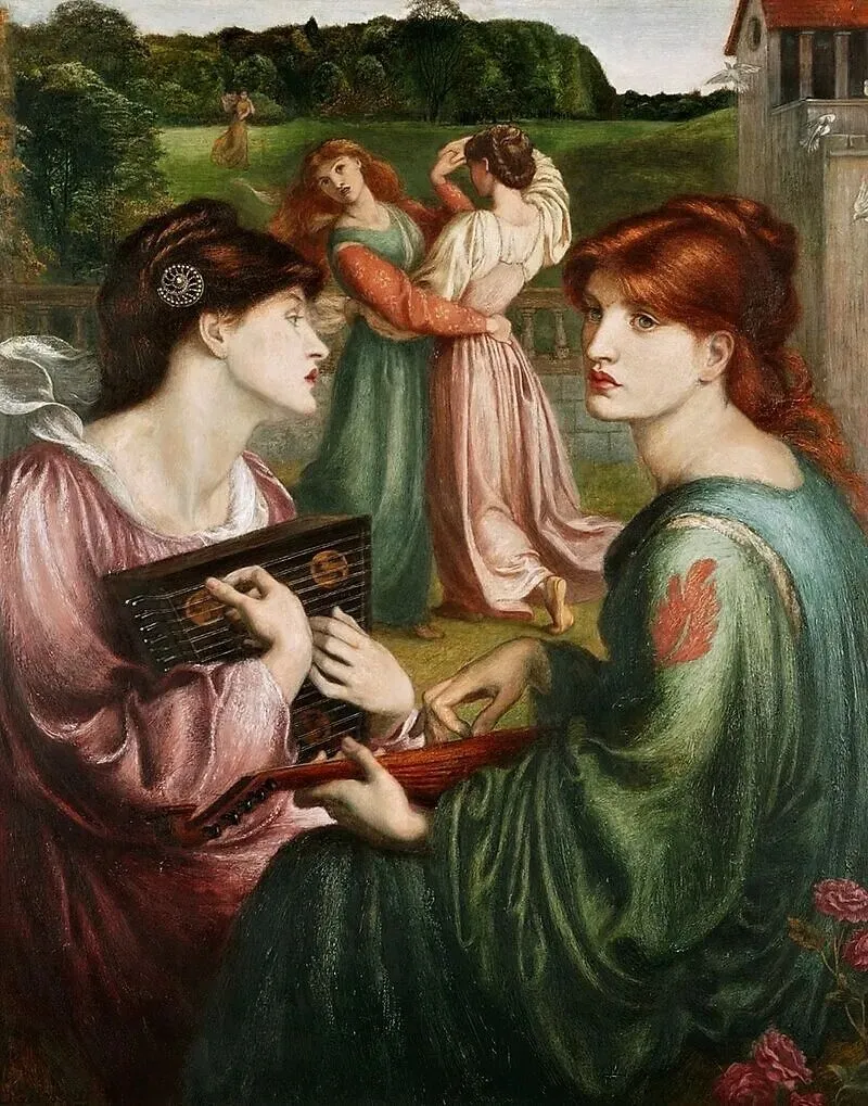 但丁·加布里埃尔·罗塞蒂,《草地凉亭》(《鲍尔草地》),1872年。右侧是罗塞蒂的模特亚历克丝·怀尔丁,左侧是玛丽亚·斯帕塔利。曼彻斯特艺术画廊,英国。