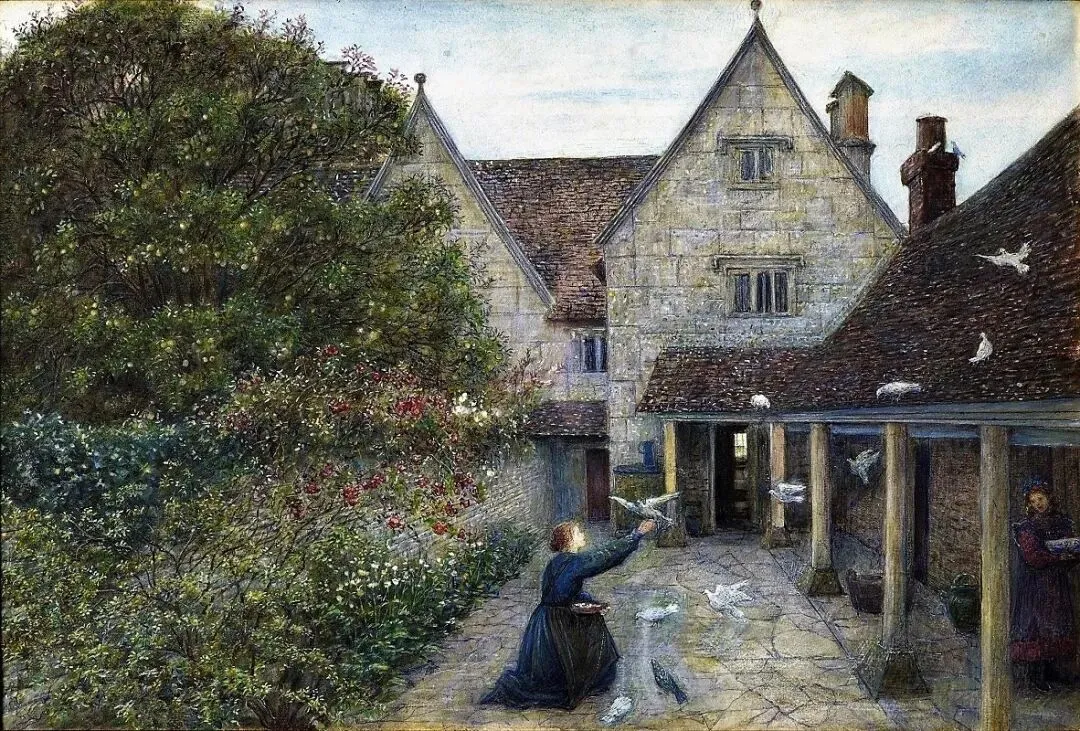 玛丽亚·斯帕塔利-斯蒂尔曼:《在凯尔姆斯科特庄园喂鸽子》,1904年。伦敦艺术学院
