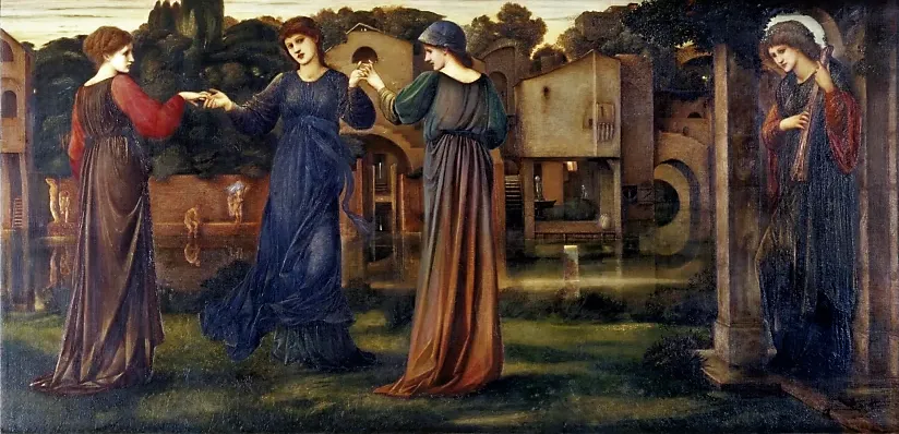 爱德华·科利·伯恩-琼斯。《磨坊》(《在河畔音乐下跳舞的少女》),1870年。从左至右:玛丽亚·赞巴科、玛丽亚·斯帕塔利和阿格拉亚·科罗尼奥。伦敦维多利亚与阿尔伯特博物馆