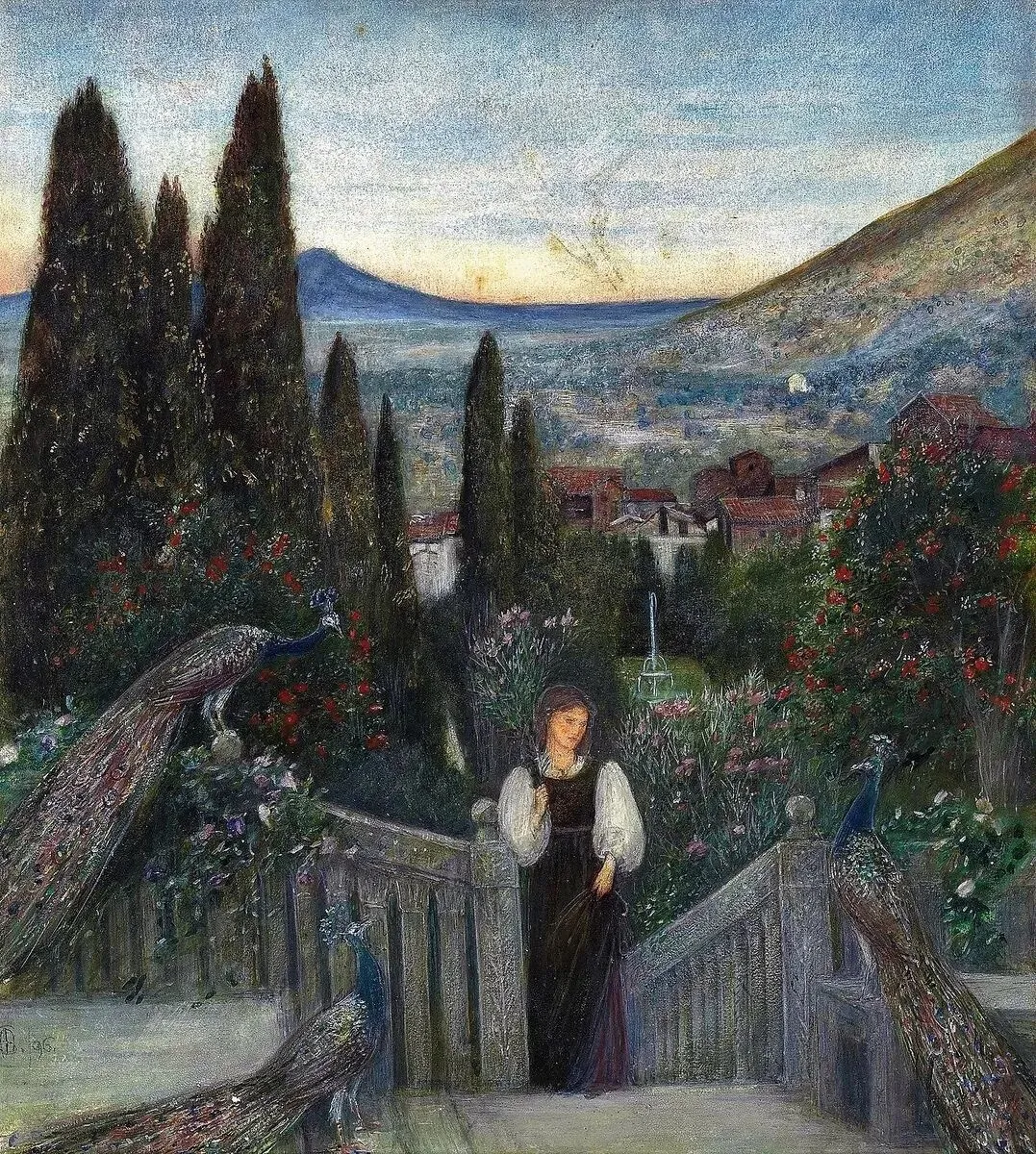 玛丽亚·斯帕尔塔利-斯蒂尔曼:《意大利风景:花园里的少女与孔雀》,1896年。私人收藏