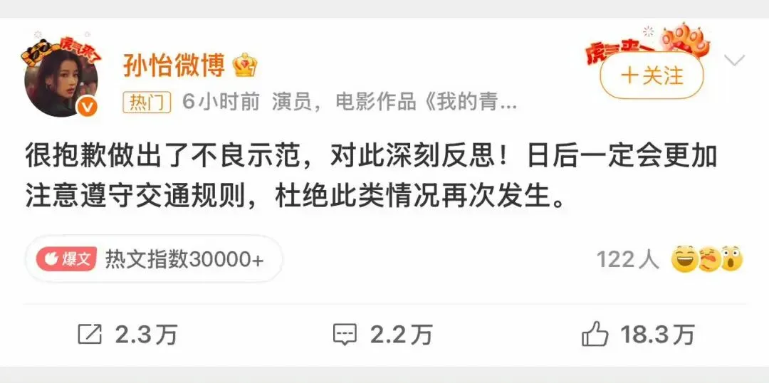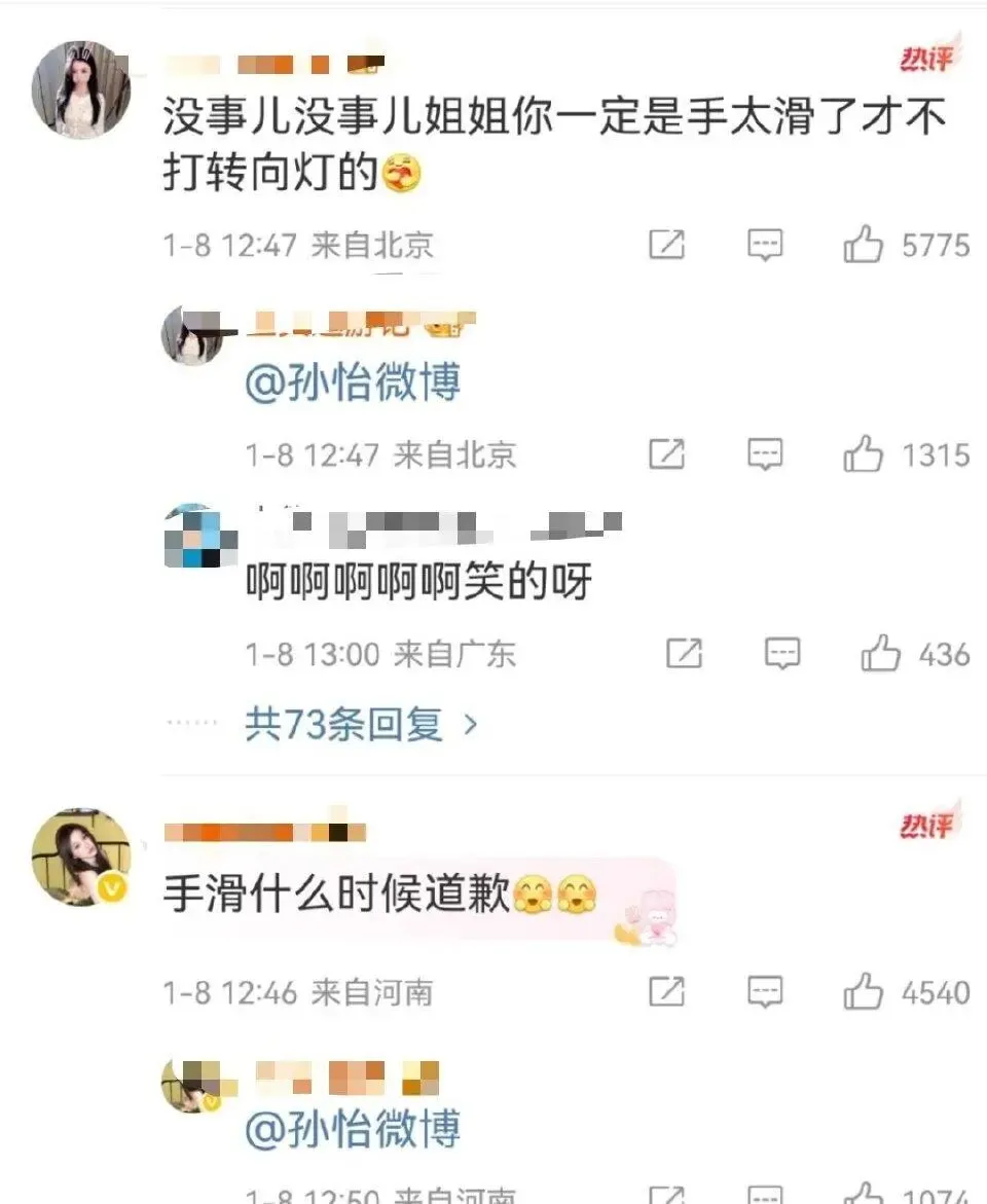 孙怡赶紧下车道歉,并且在社交媒体上公开了自己的行为,声称一定会杜绝此类事件再次发生