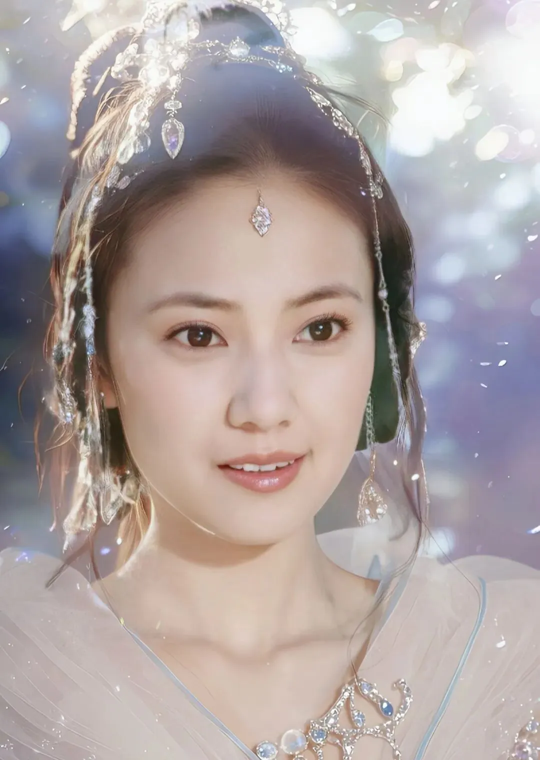 她的美,带着一种不沾凡尘的仙气,眉眼间既有少女的灵动,又有超越年龄的沉静。即便多年过去,她饰演的小龙女依然被无数观众奉为经典,无人能及。
