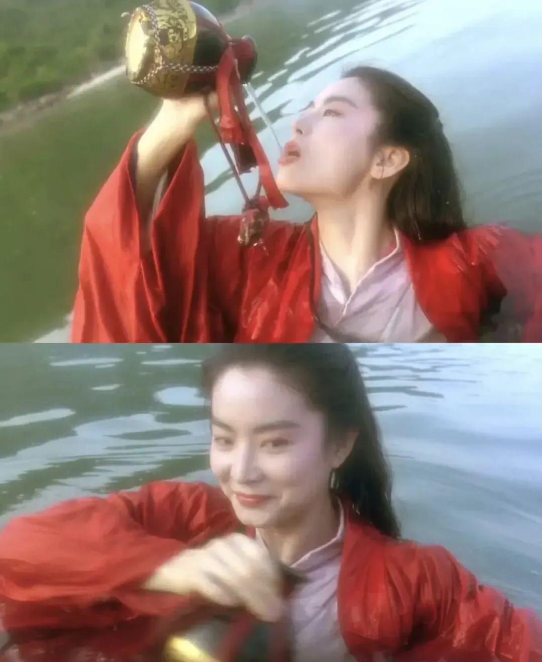 林青霞的东方不败,既有男子的英气,又有女子的妩媚,雌雄莫辨,霸气侧漏。一袭红衣,一壶酒,水中仰头饮酒的那个镜头,成为了永恒的电影经典。林青霞之后,世间再无东方不败。