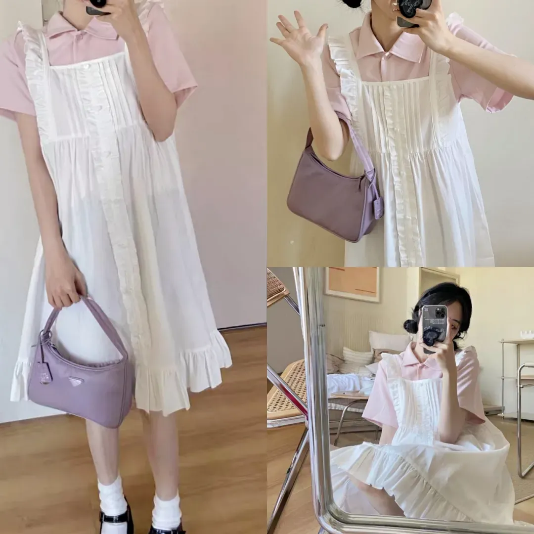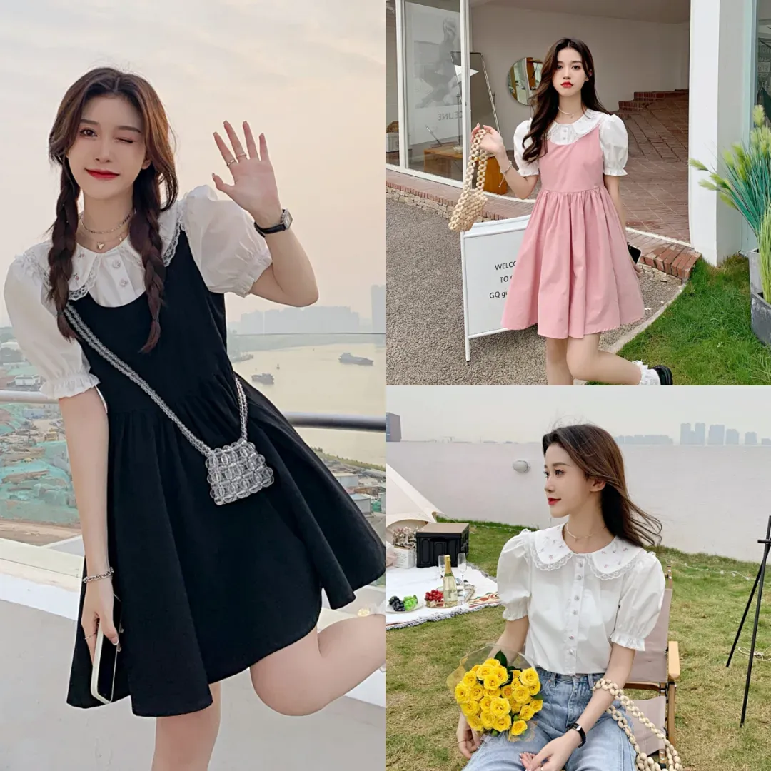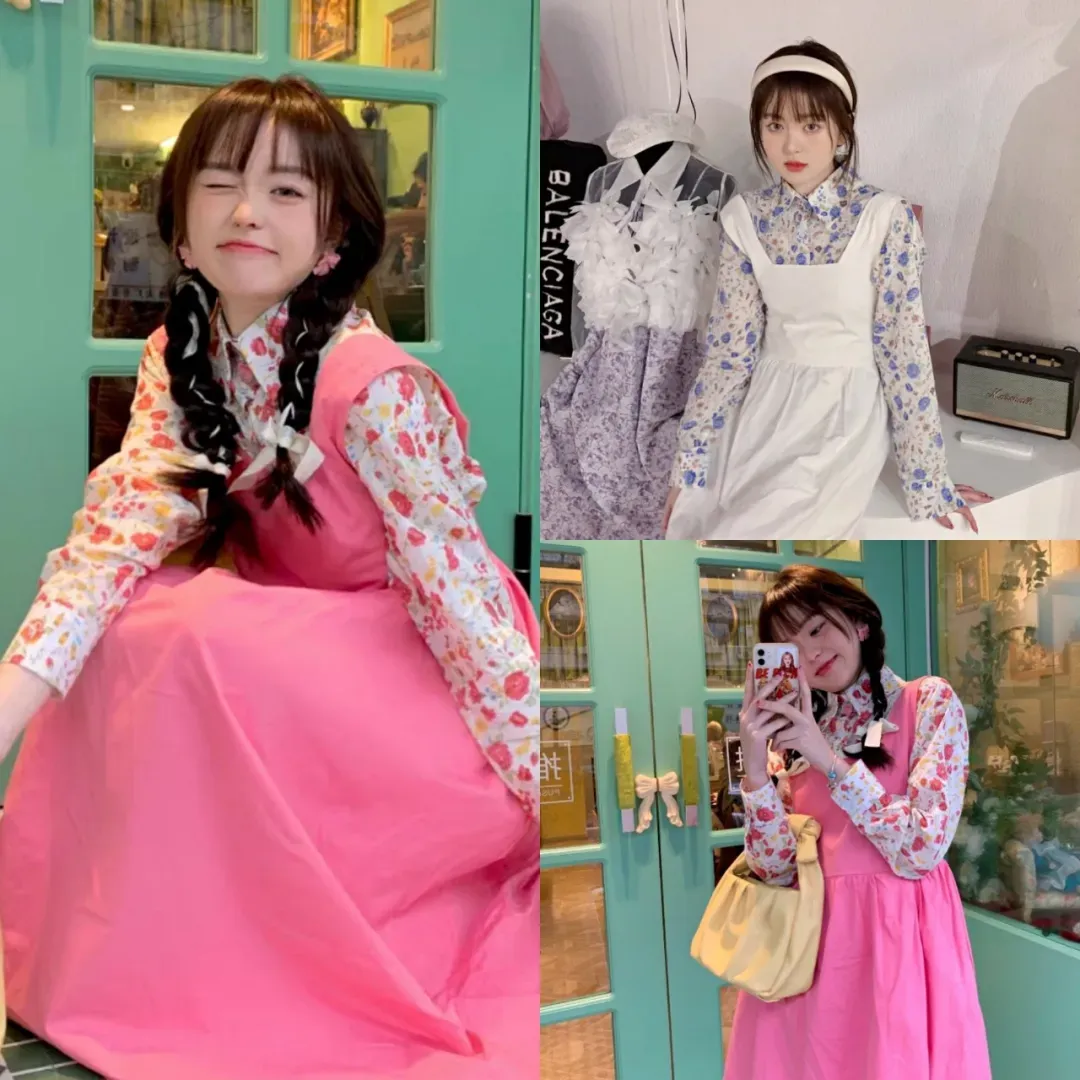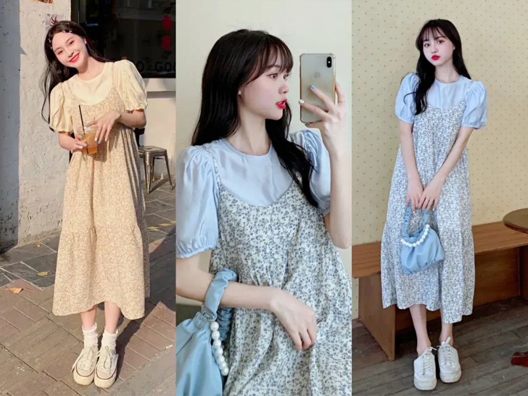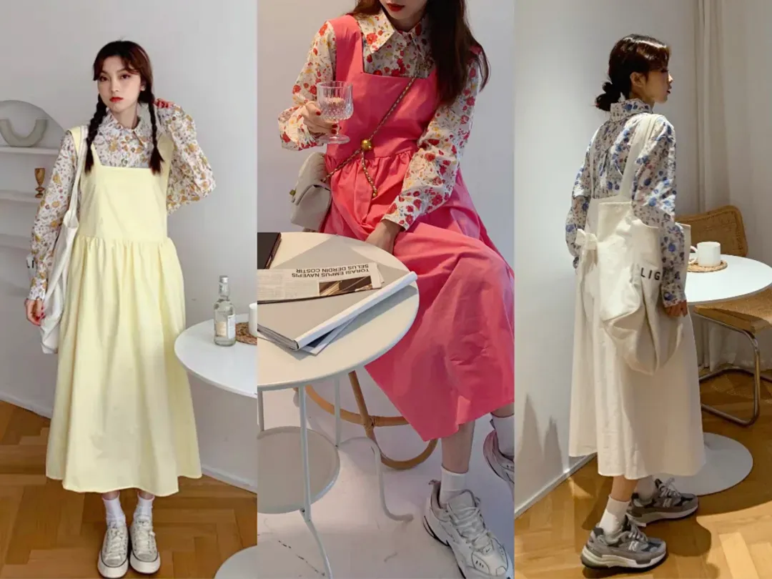 偏向比较可爱甜美风格的女生来说,可以内搭带有娃娃领这种款式的衬衫来凹造型,然后外搭蓬蓬裙摆的吊带裙,看着就很甜美feel,而且还带有青春感,好减龄哦!