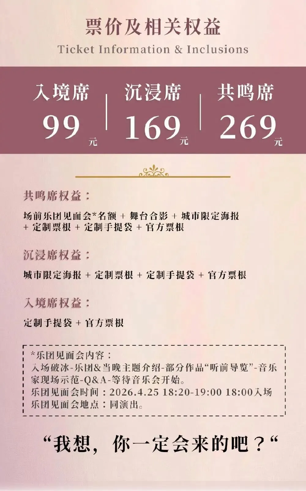 本场演出18:00入场,因演出票的特殊属性,购票后,因个人原因无法观看,不退不换,敬请谅解。一人一票,儿童全票。凭票入场,对号入座。