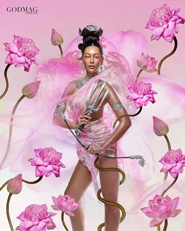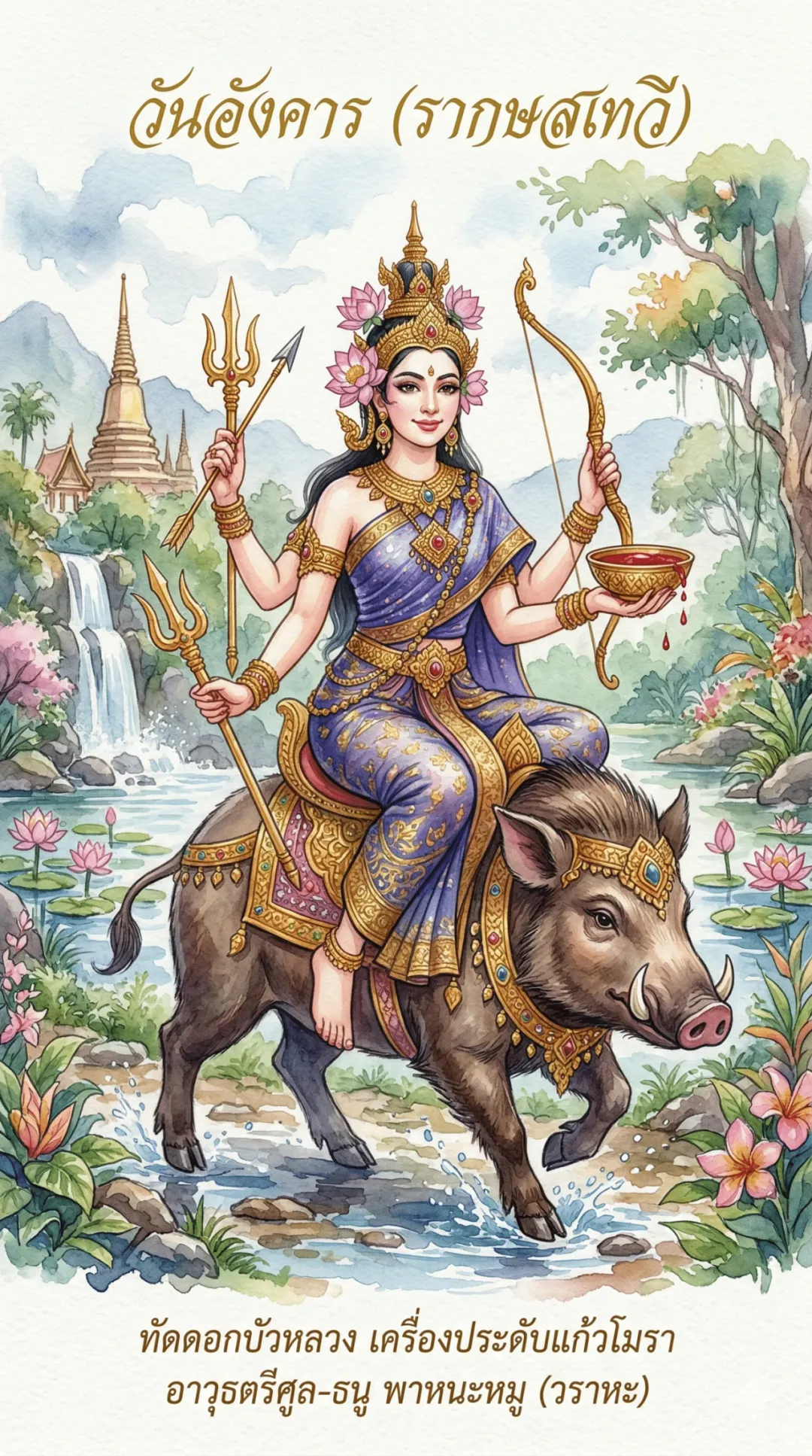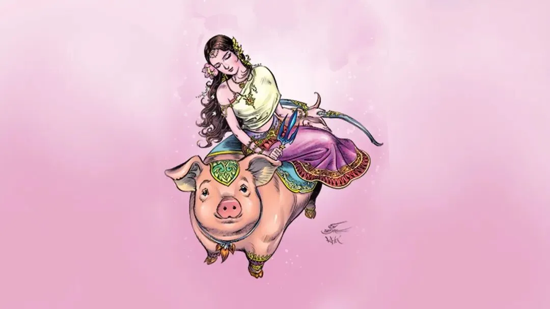 她耳畔缀着莲花,周身饰以玛瑙,手中紧握三叉戟与长弓,野猪为其代步坐骑。