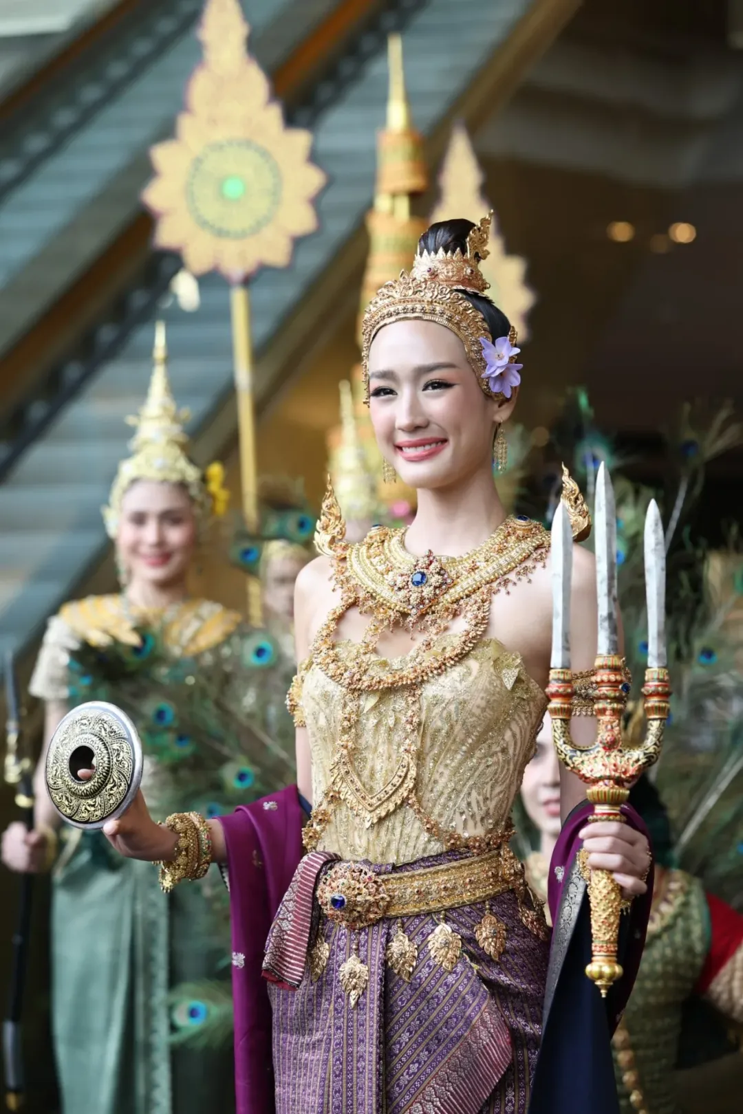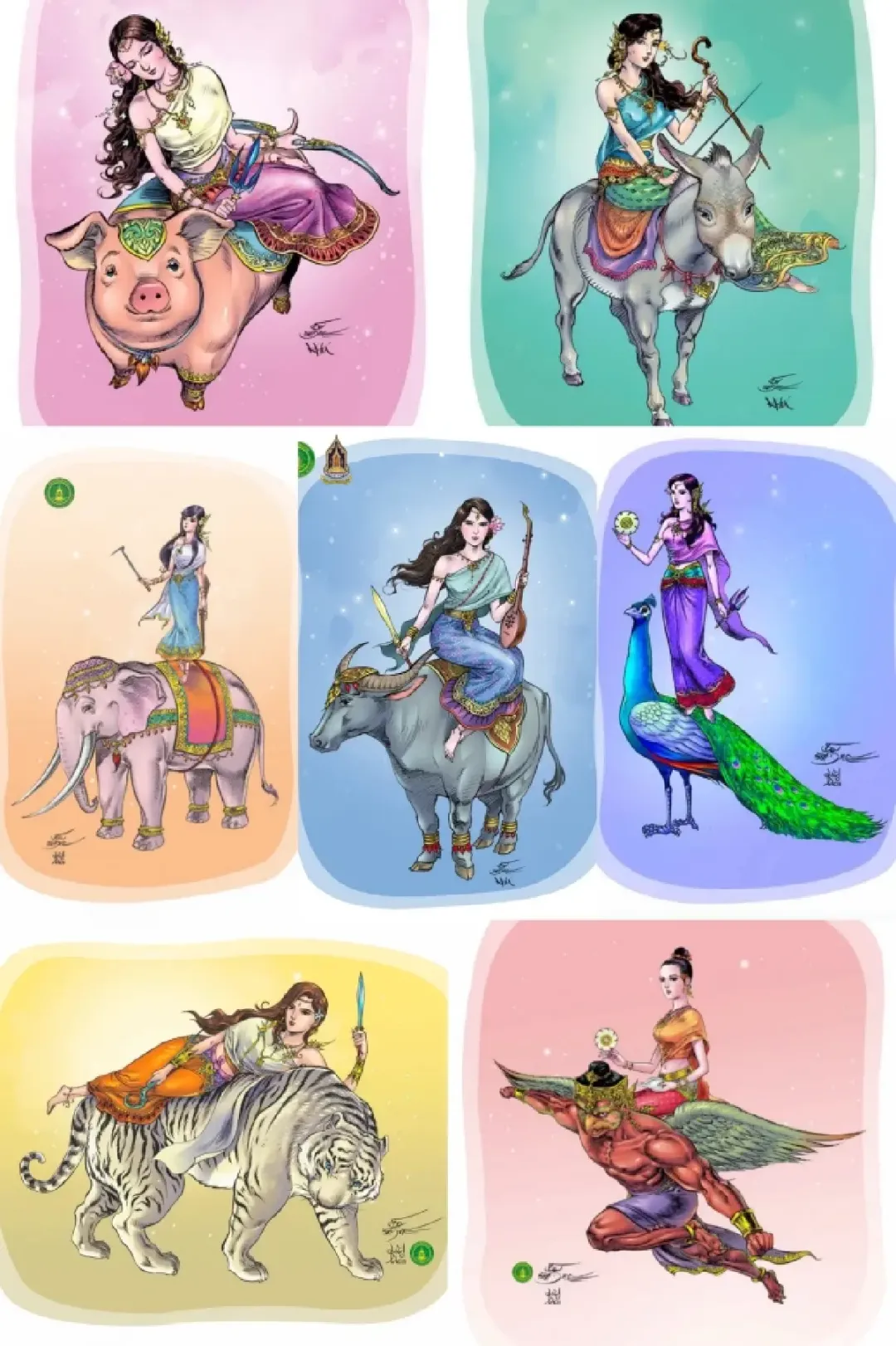 七位女神各对应一周中的一天,每逢宋干节当日所属星期,便由对应女神值守,她们身着精致泰式传统华服,手持专属法器,以各类瑞兽为坐骑,服饰色彩亦与星期专属色相契合,成为宋干节最具辨识度的文化印记。