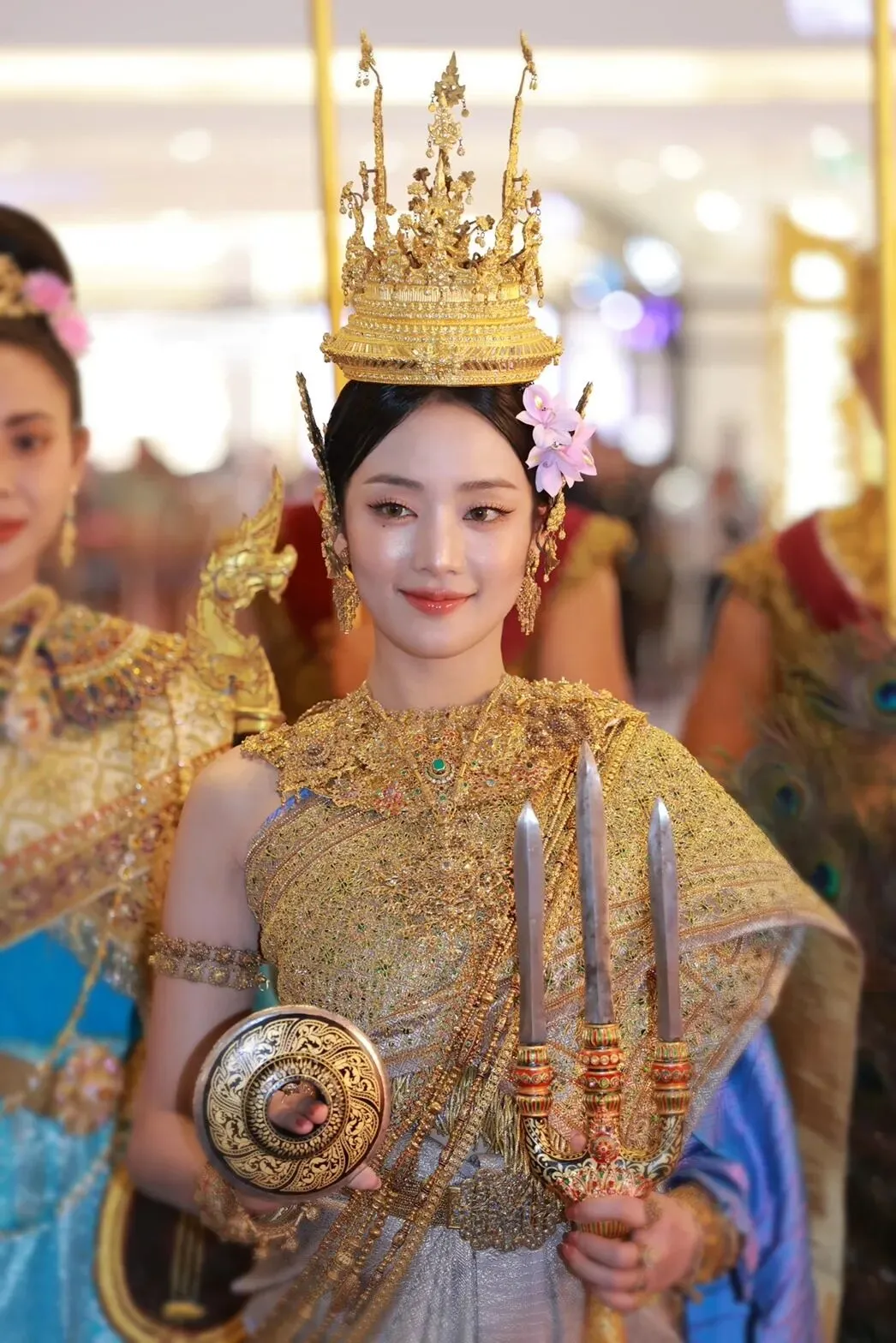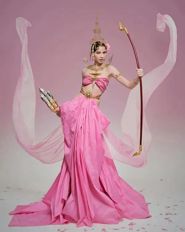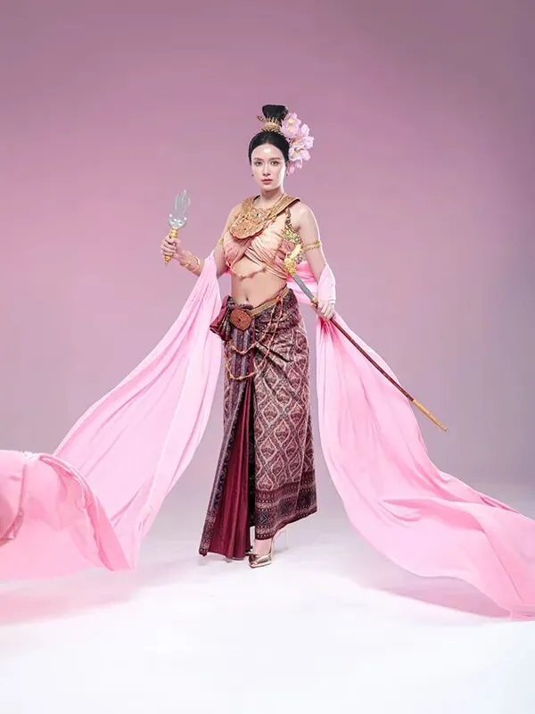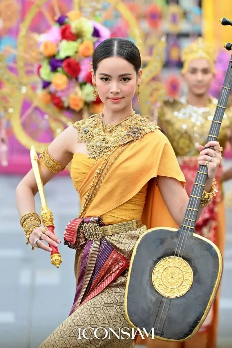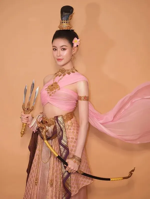 2022年,因《初恋这件小事》被观众熟知的“小水”扮演者Baifern平采娜·乐维瑟派布恩,身着蓝绿色古典泰装惊艳登场,手中执掌短剑与乐器,明艳大气的造型,将女神的气场与风范展现得恰到好处。