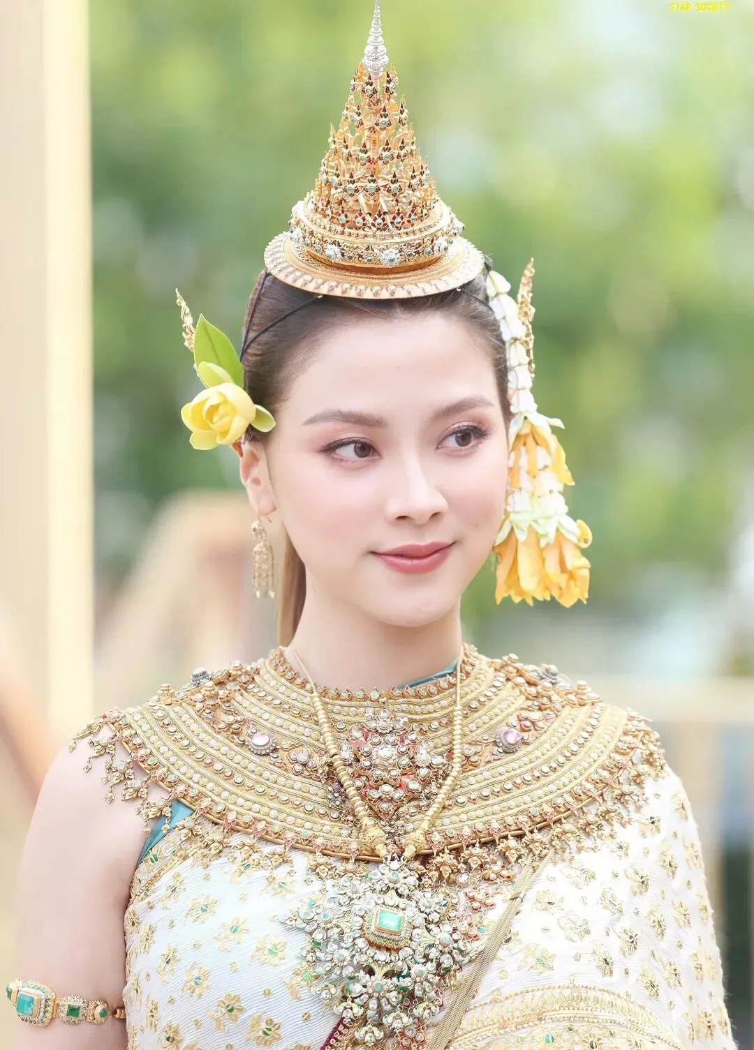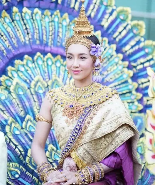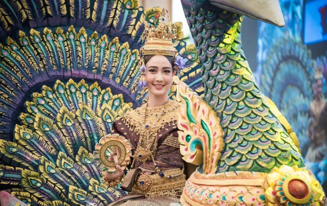 2018年,凭借《天生一对》爆红的Bella蓝妮·卡彭,一袭金色泰式华服搭配孔雀花车,仙气与古典雅致相得益彰,被众多民众誉为“史上最动人宋干女神”之一;