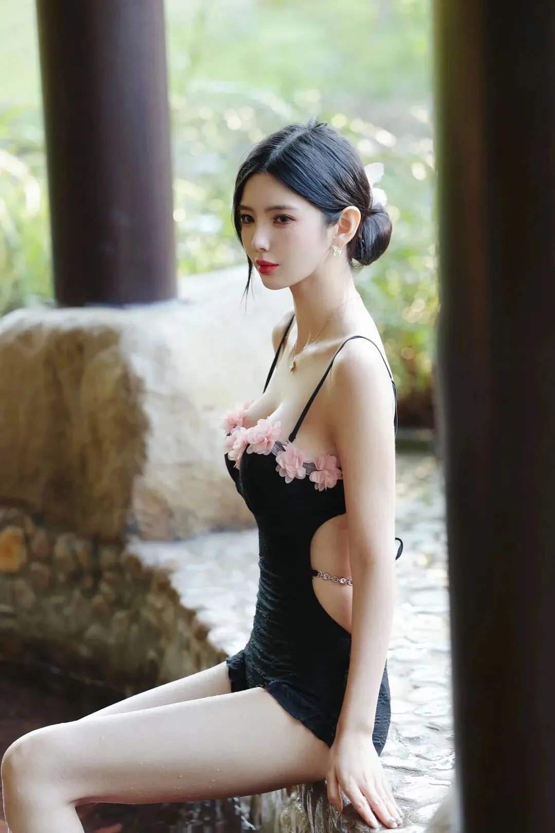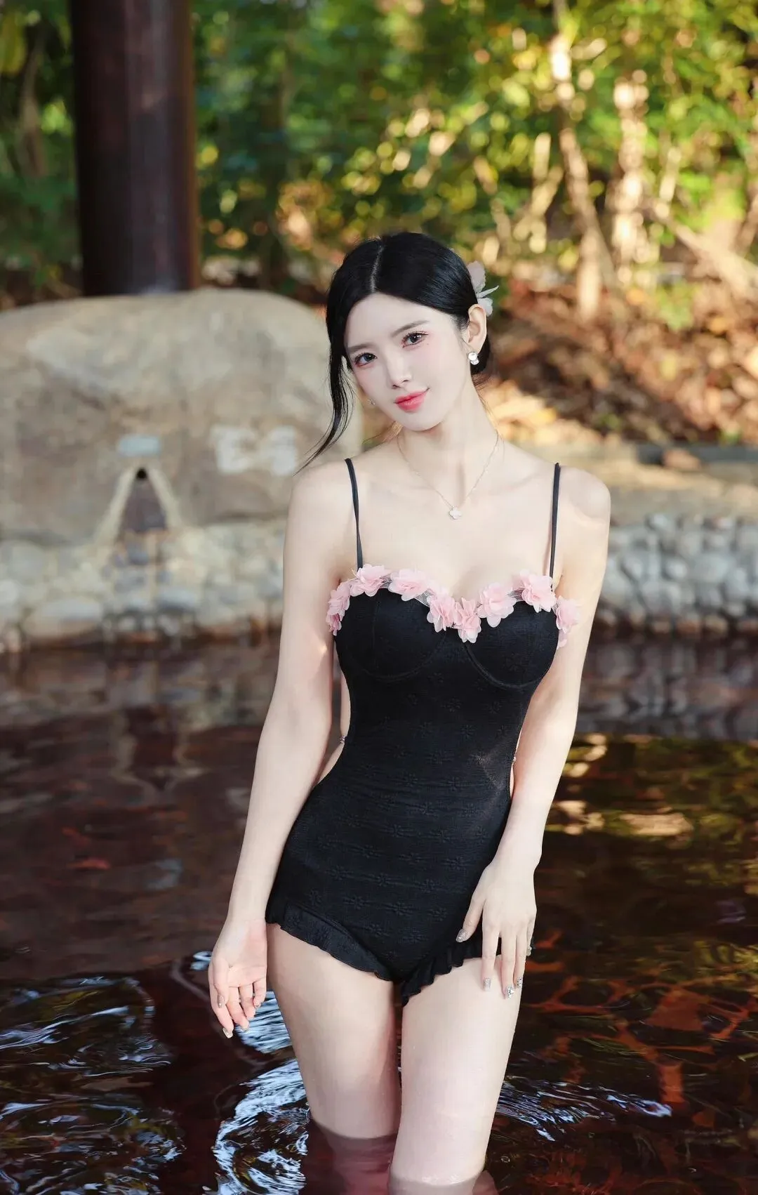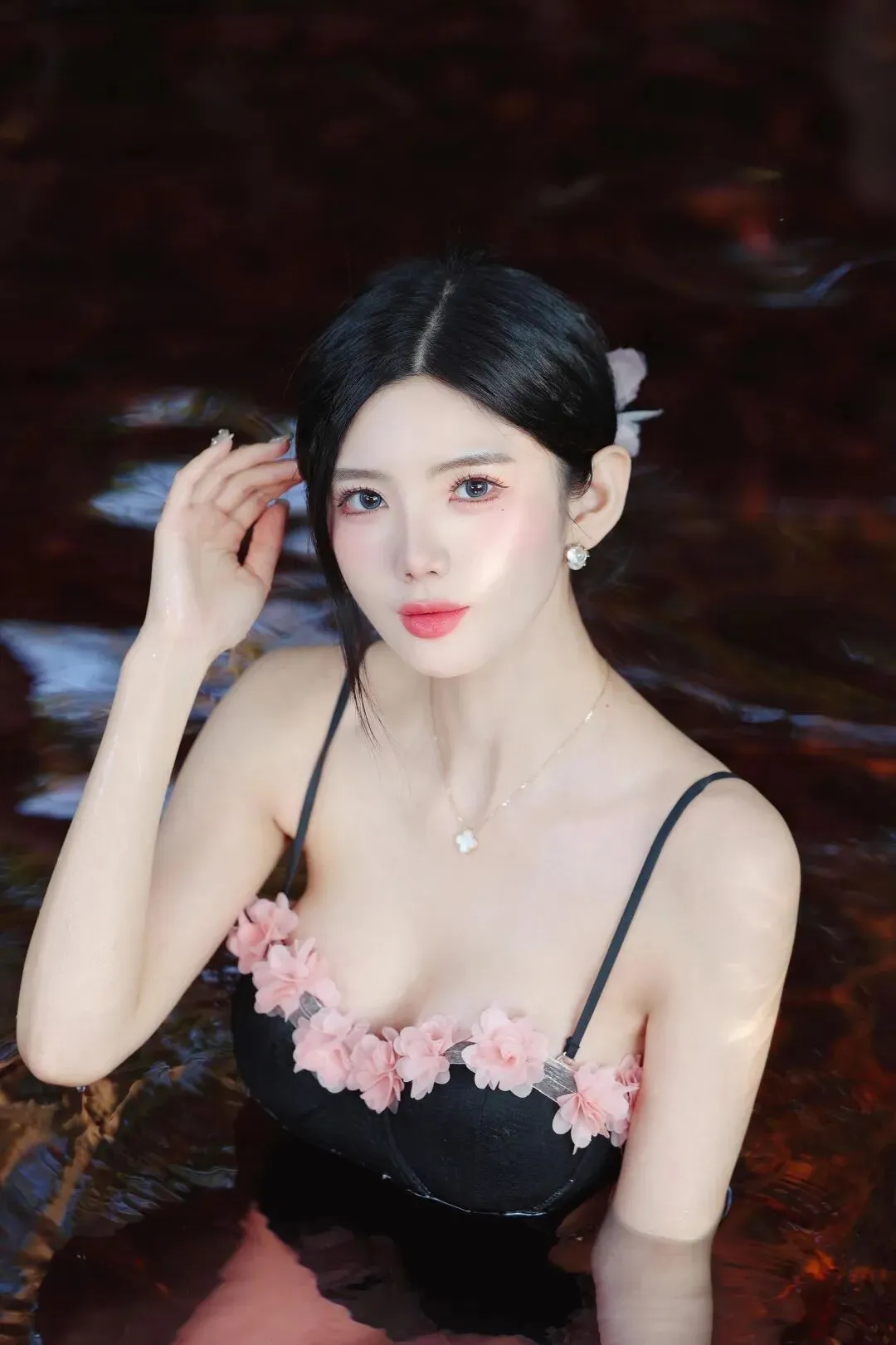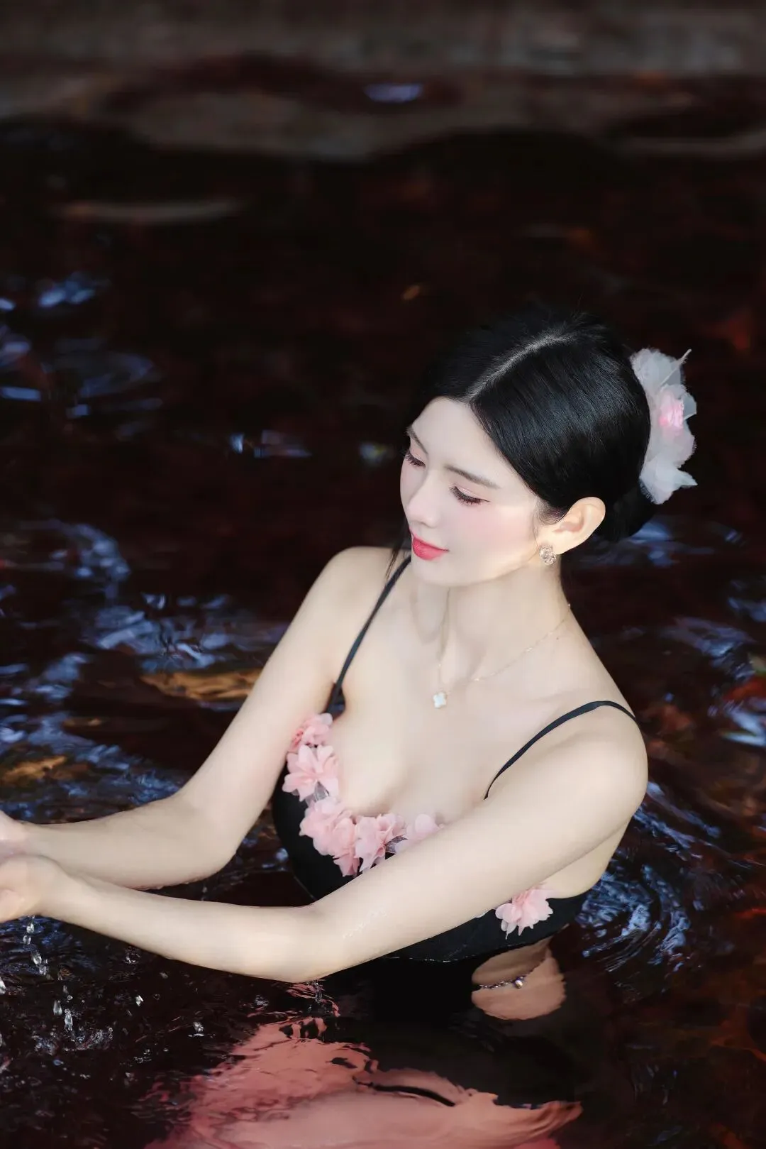 📷林间溪水潺潺,黑色吊带泳衣缀着粉花,是独属于夏日的温柔浪漫。耳畔别着淡粉小花,耳畔碎发轻扬,水光漫过脚踝,每一寸光影都裹着清甜与慵懒,把森系氛围感拉满✨