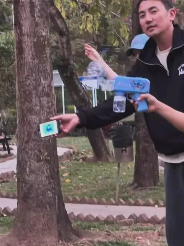 萧正楠拿着吹泡泡机绕圈奔跑。