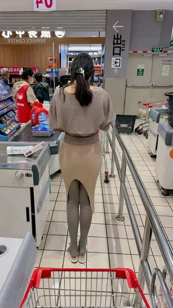 第一位女生站在冷柜前面挑酸奶,一身卡其色系温婉得无法移开视线。浅色露肩针织衫+同色半身裙=柔光感美人骨。露肩设计太有韵味了,锁骨线条若有若无,不会太过张扬,又有点小女人味。裙子属于竖坑条,显瘦效果出色。她蹲下选东西的时候,裙摆散开的形态十分优雅。