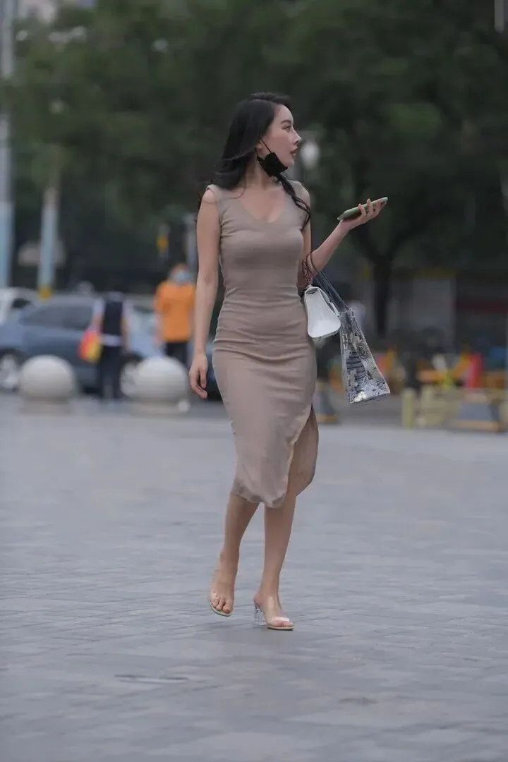 脚上这双透明的PVC高跟凉鞋选择得太好。鞋跟是隐形的,穿了之后,腿立即变长。一点也不夸张,自然又心机。裙摆还有一个高开叉,走路时小腿偶尔露出。有点小性感,但是并不俗气。