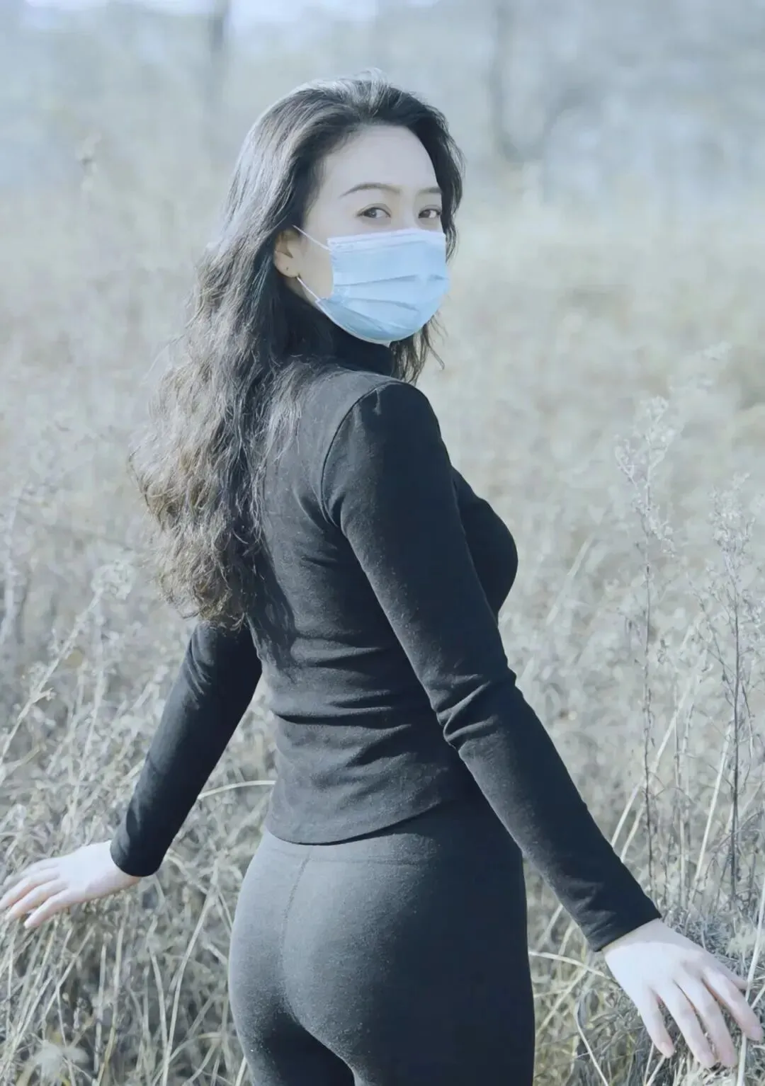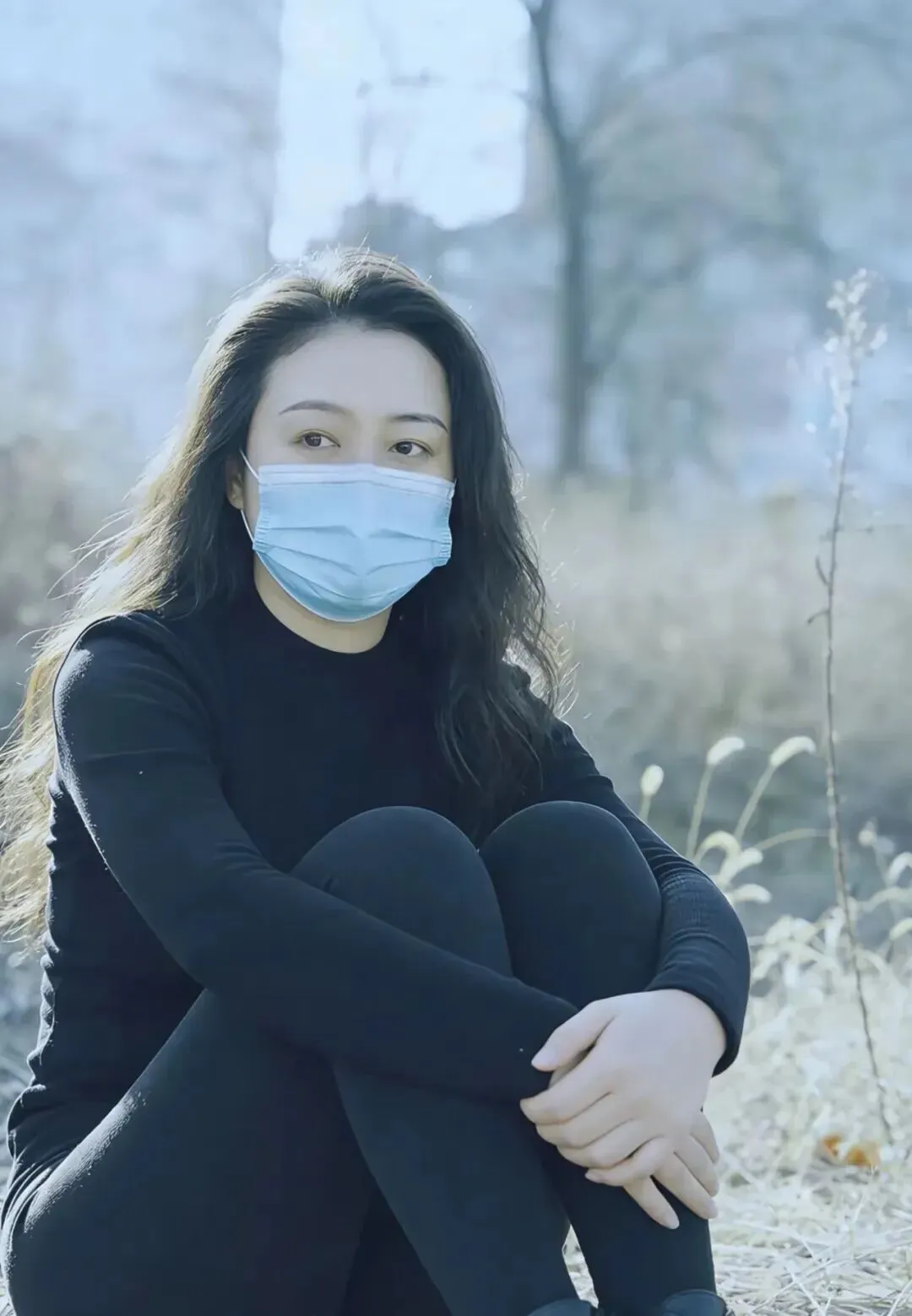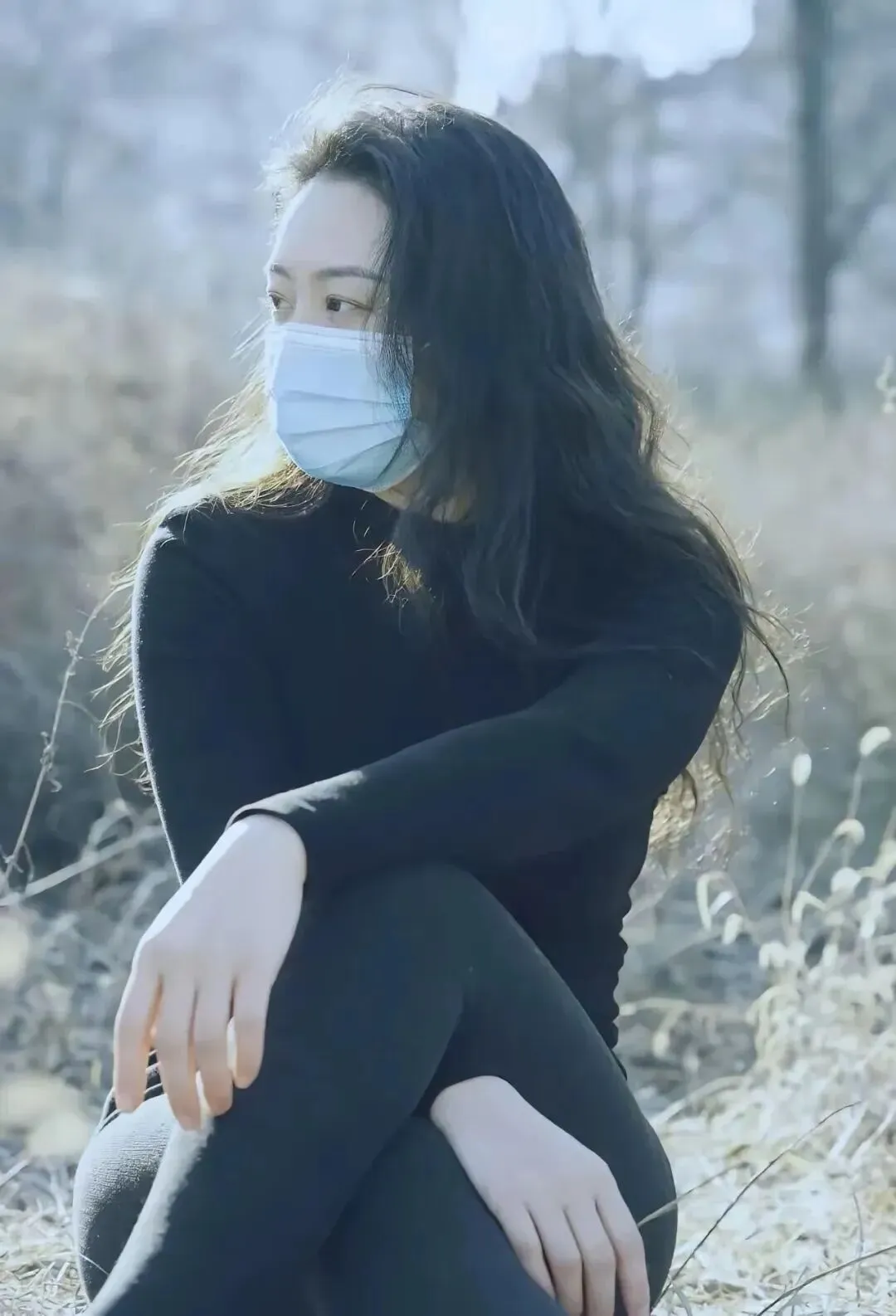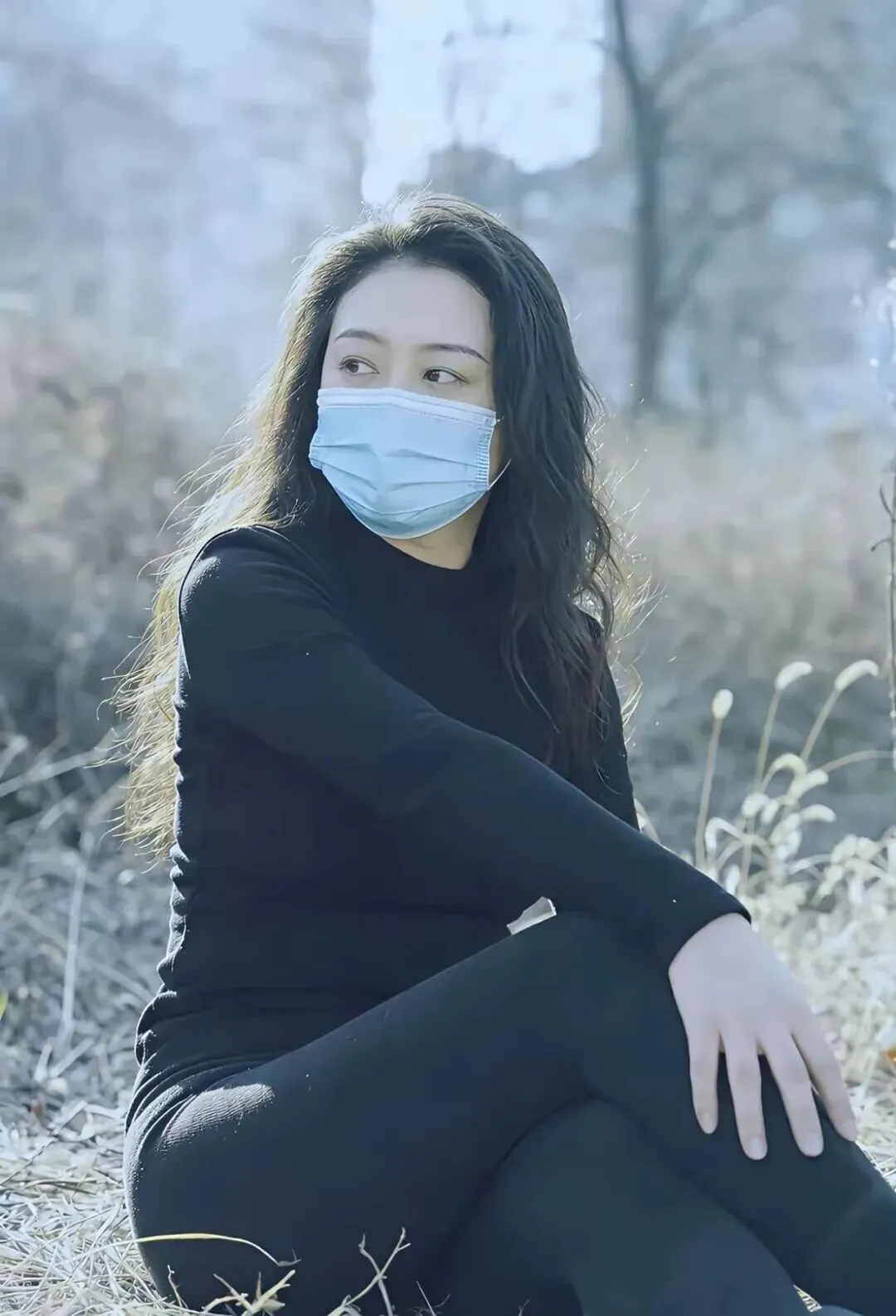 穿衣服不能只看衣服本身,人的状态同样重要。这位小姐姐的松弛感太好了。她一头黑发披肩而下,非常温婉可爱。戴一个浅蓝色口罩,使自己处在同背景的冷色当中,多出一份距离的感觉。她在枯草地上坐着的状貌,就像是在那里自得其乐地享受时光一样,左腿弯曲着,右腿架上去,双手随意搁在身前,整个人很悠闲、自在。这并不是硬装出来的,而是非常自然的。