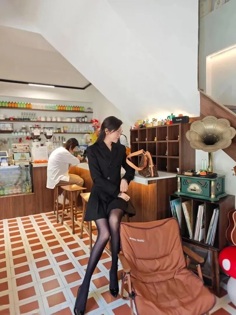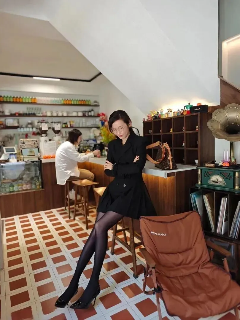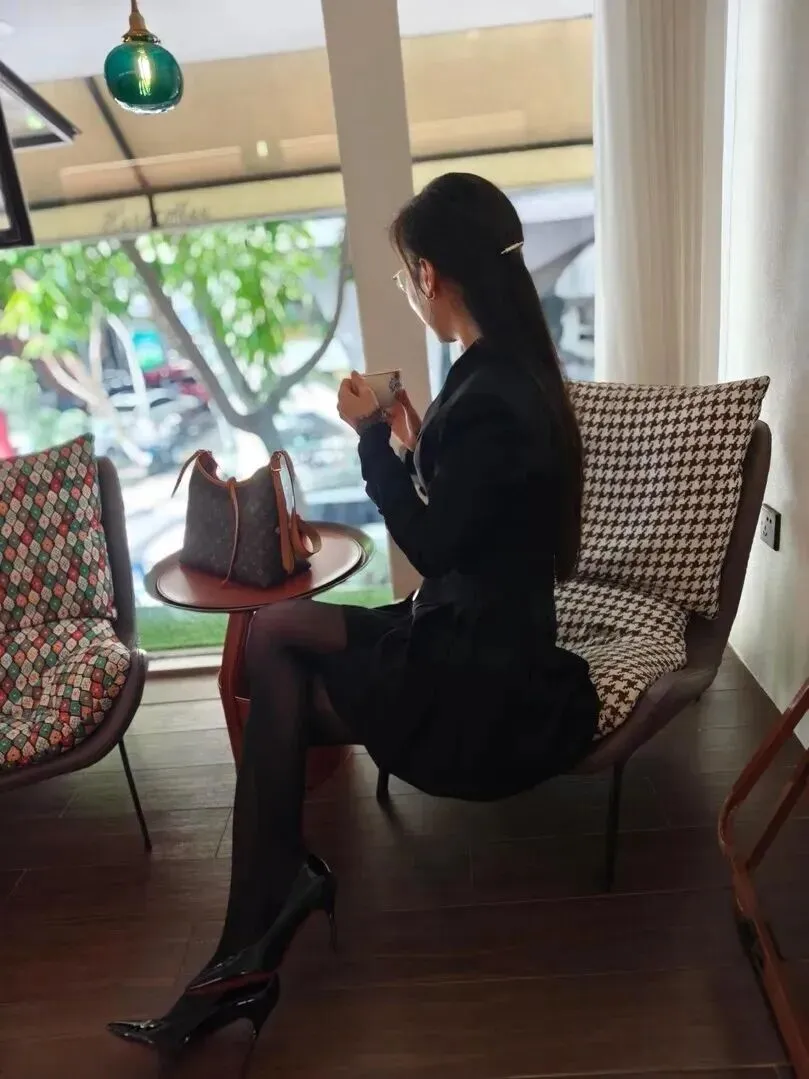 到周二下午,画风突然变得松懈起来。依然是那条西装裙,但是加了副金丝眼镜,整个人立刻多了一份书卷气。当天也在咖啡馆偶遇了她,翘着脚坐在复古椅上用手机刷屏,手端一杯拿铁。随意却有着特别之处的气质,经常出现于剧中的场景再一次展现出来。当看到这样一份反差的时候,就已经意识到职业着装也有着绝活儿,是正式场合下以柔克刚来结束这场战局的手段。