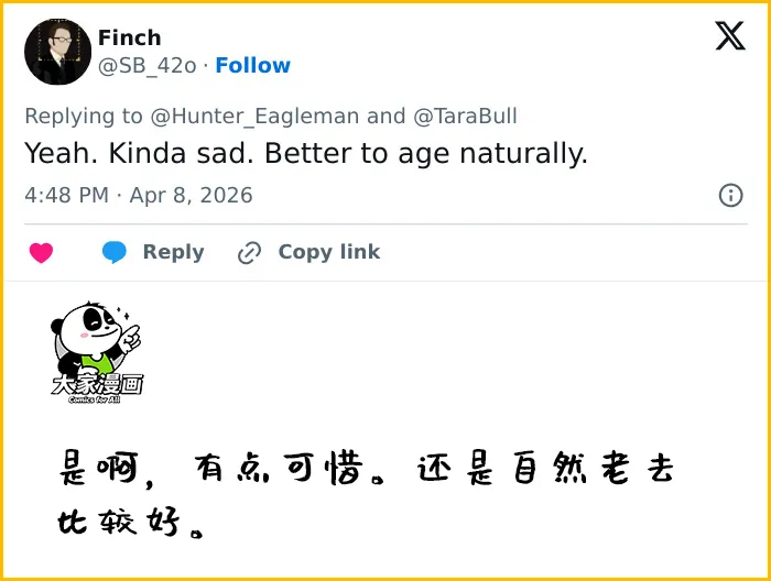 “说实话,这太令人难过了,”另一个人说。“每次我看到女性做如此极端的整形手术,都让我更加坚定要自然老去。”