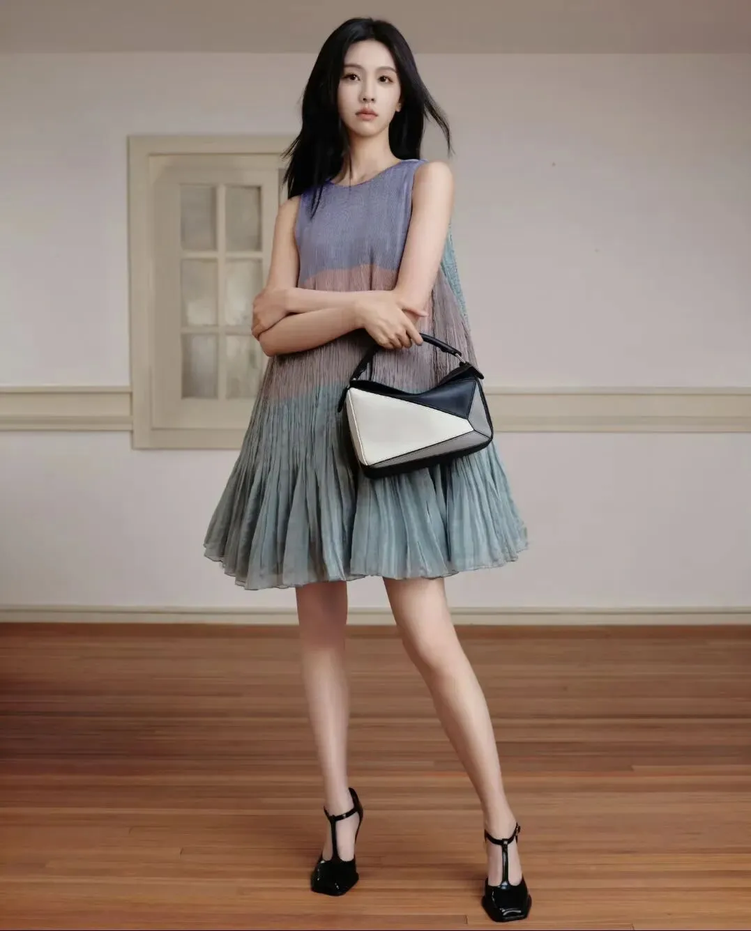 再来这套气质挂!渐变压褶无袖连衣裙真的绝了!灰紫+粉棕+薄荷绿的渐变配色,温柔又高级,A字裙摆藏肉显瘦,对各种身材都超友好!搭配黑色T字带玛丽珍鞋,瞬间拿捏知性优雅感,通勤、约会、参加小聚会穿,直接美成全场焦点!
