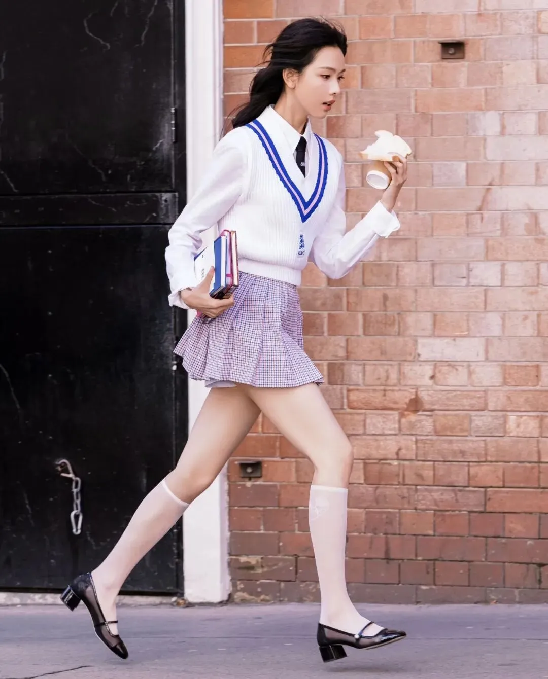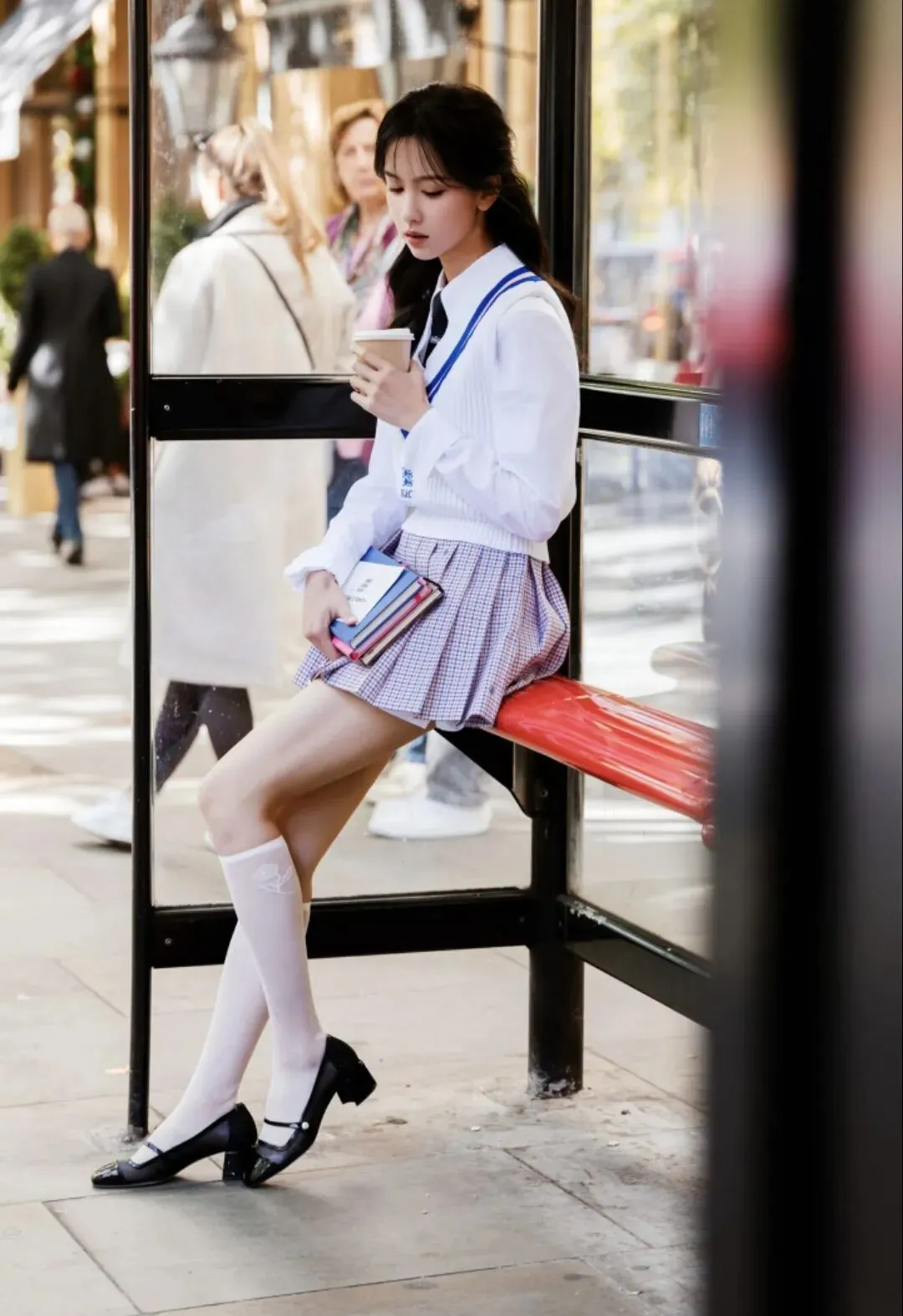 这套学院风真的杀疯了!白衬衫+V领针织马甲+格纹百褶裙,妥妥的校园女主既视感!搭配白色中筒袜+黑色玛丽珍鞋,青春感扑面而来,减龄效果直接拉满!不管是学生党还是想重返校园的姐妹,这套闭眼入,拍照巨出片!