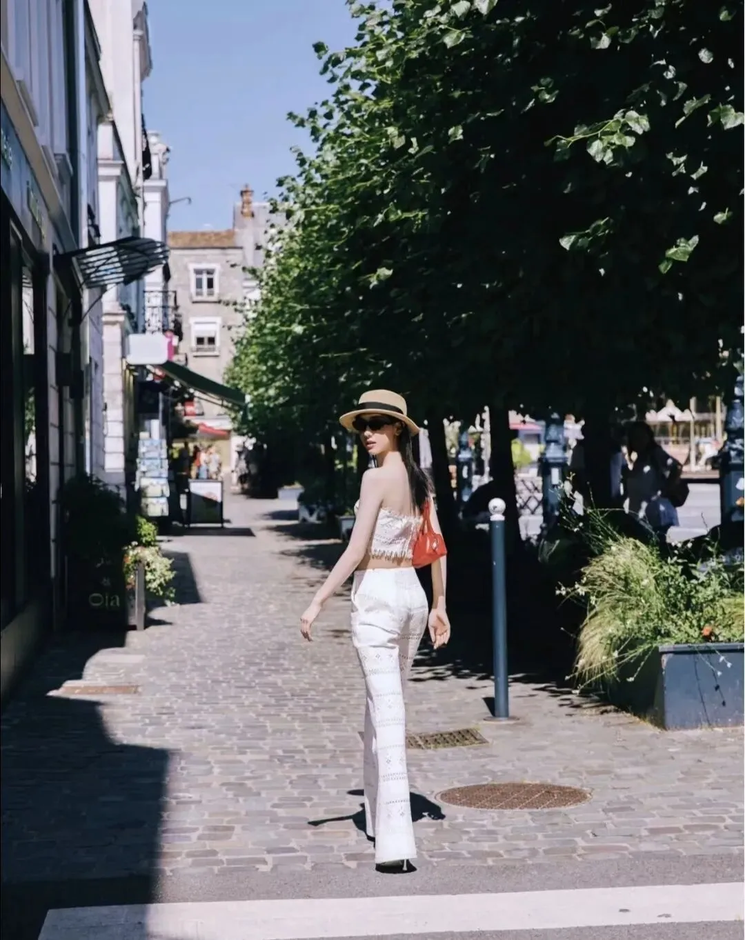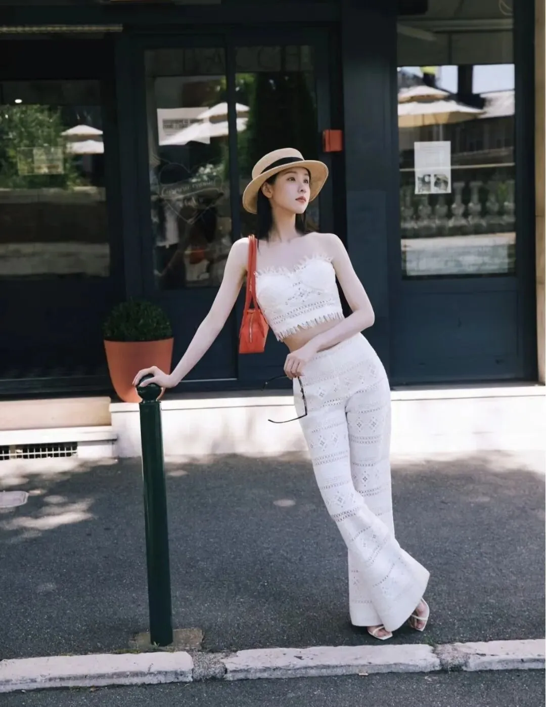 度假风穿搭天花板来了!白色钩花抹胸+同色系阔腿裤,整套同色系穿搭高级感拉满!抹胸设计露出肩颈线条,钩花元素自带度假氛围,阔腿裤显高显瘦,搭配草编帽+红色腋下包,氛围感直接拉满!去海边、度假穿,拍照巨上镜,妥妥的度假女神!