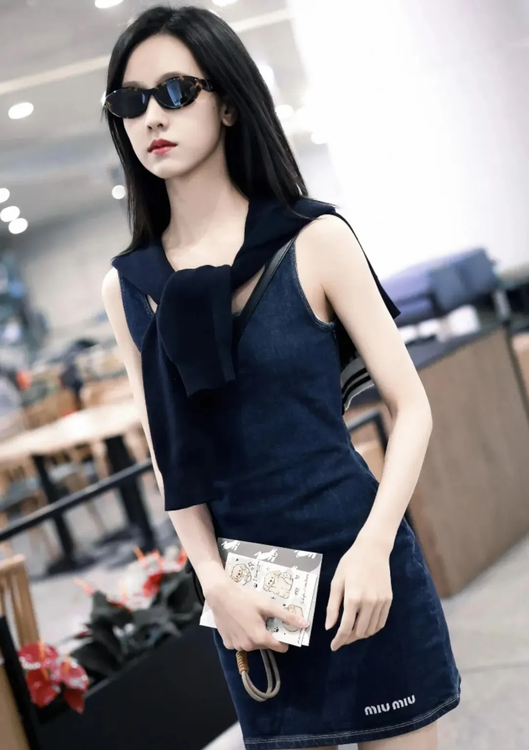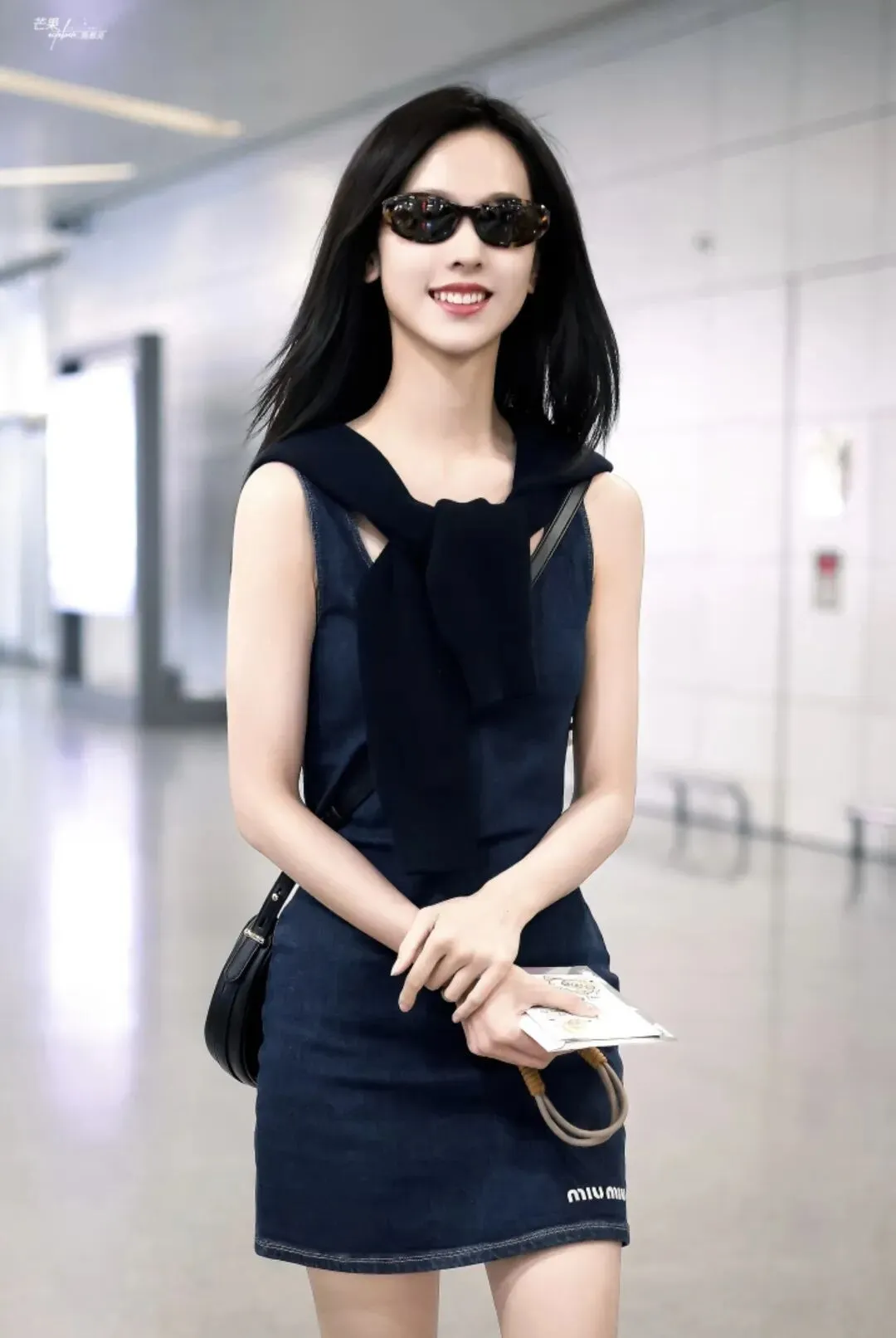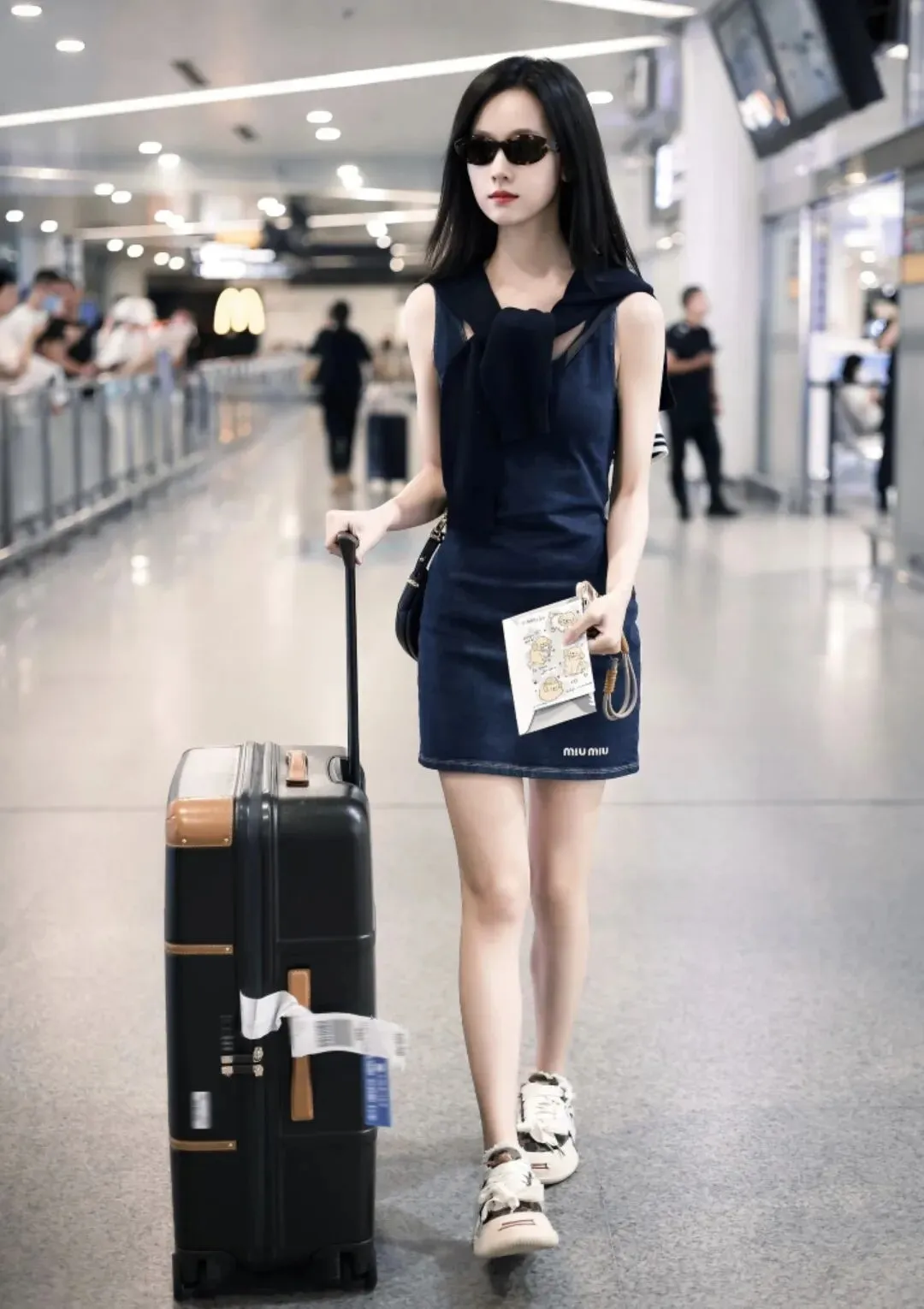 机场穿搭也超绝!深蓝色无袖牛仔连衣裙,修身版型勾勒身材,大领口设计显脸小,搭配同色系披肩,层次感拉满!踩一双复古休闲鞋,拉上行李箱,又酷又飒,日常通勤、出差旅行穿,舒适又时髦,明星感直接拉满!
