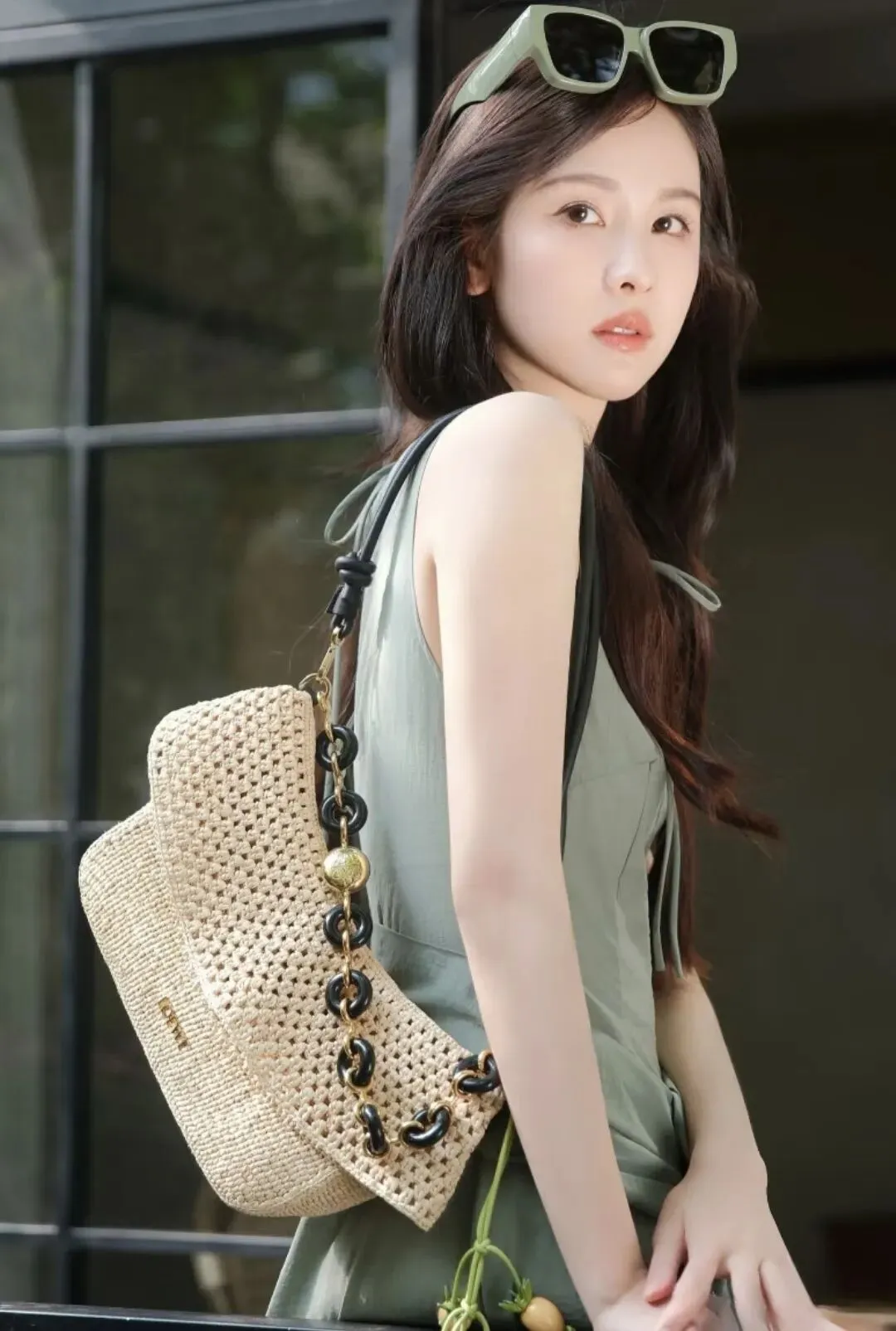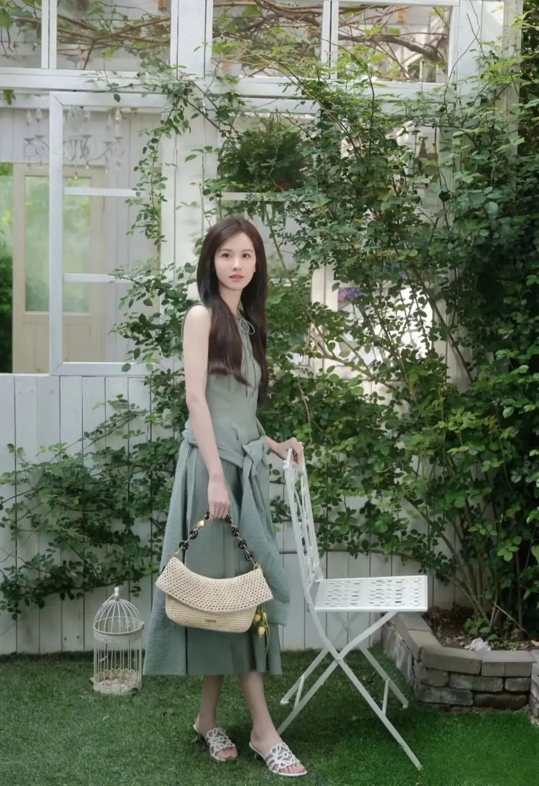 最后这套温柔风!灰绿色无袖收腰连衣裙,温柔到骨子里!收腰设计凸显腰线,裙摆飘逸,自带仙气,搭配草编腋下包+编织凉鞋,法式氛围感拉满!约会、下午茶穿,温柔又优雅,直接美成氛围感美女!
