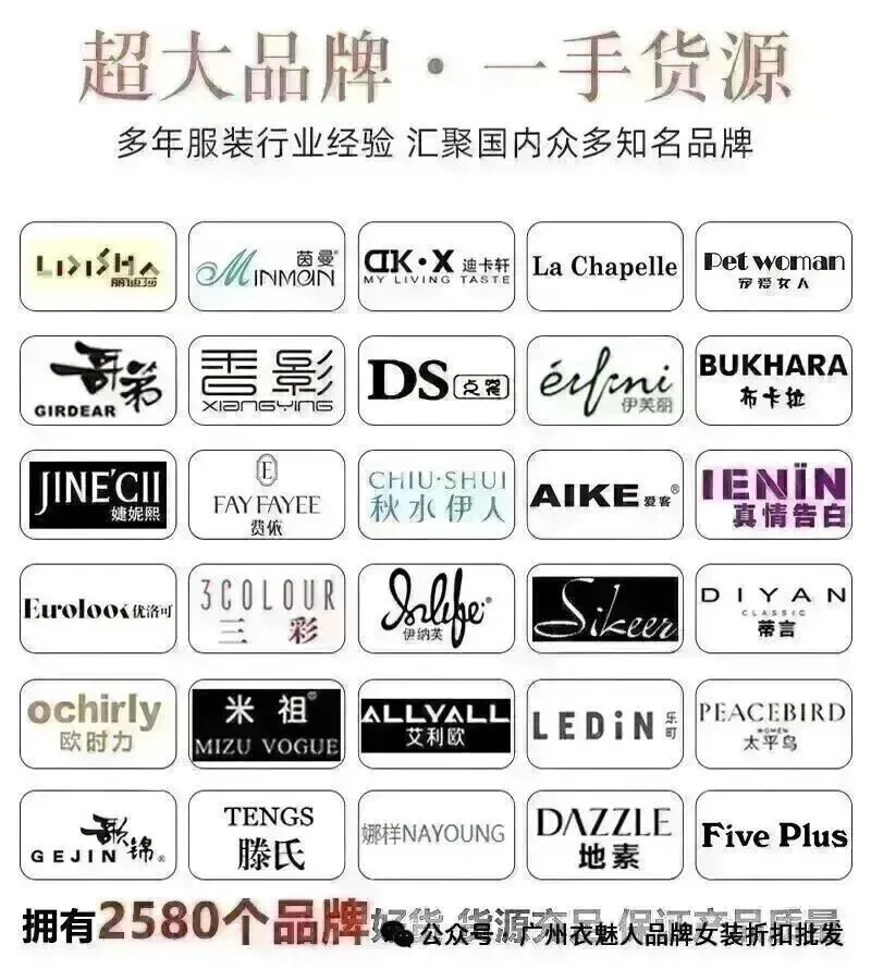 常驻品牌公司旗下常驻品牌,有国风元素,晒谷场,遇见天,见花开,幽篁楮墨吉丘古儿,璞墨,箴言,夏姿绮,忆花寻,花之晨  伦诗,朵拉薇拉,芭依璐,世纪蓝天,UNCODED,Tryme,ANOTHER ONE,UHOT,马可未,维伊,银钻,孔雀夫人 谜柯,梦莎奴,JC,周仕依林,琢盈,兰梦萱,注释,宝莱国际,第五朵,素莹,万古汇,蜂后国际,蒂缇,阿缇娜,爱奴娇,昆诗兰,唯弋,珞炫,黛玫恩,认同,新丝,韩氏伊人,我爱巧克力,CDG小红心,玛塞莉,痕迹 风行凯琦,蔻丽,艾沸,XINGAI,认同,名妹,言梭,吉丘古儿,飞度,秋熠,谷度,唤觉,紫布语,伊华欧秀,KATSURINA,MasiliEr,三彩等一线专柜大牌 涵盖众多风格,年龄段数百个知名品牌,品牌款式丰富,千平展厅,每日上新 专业售后,无忧开店。