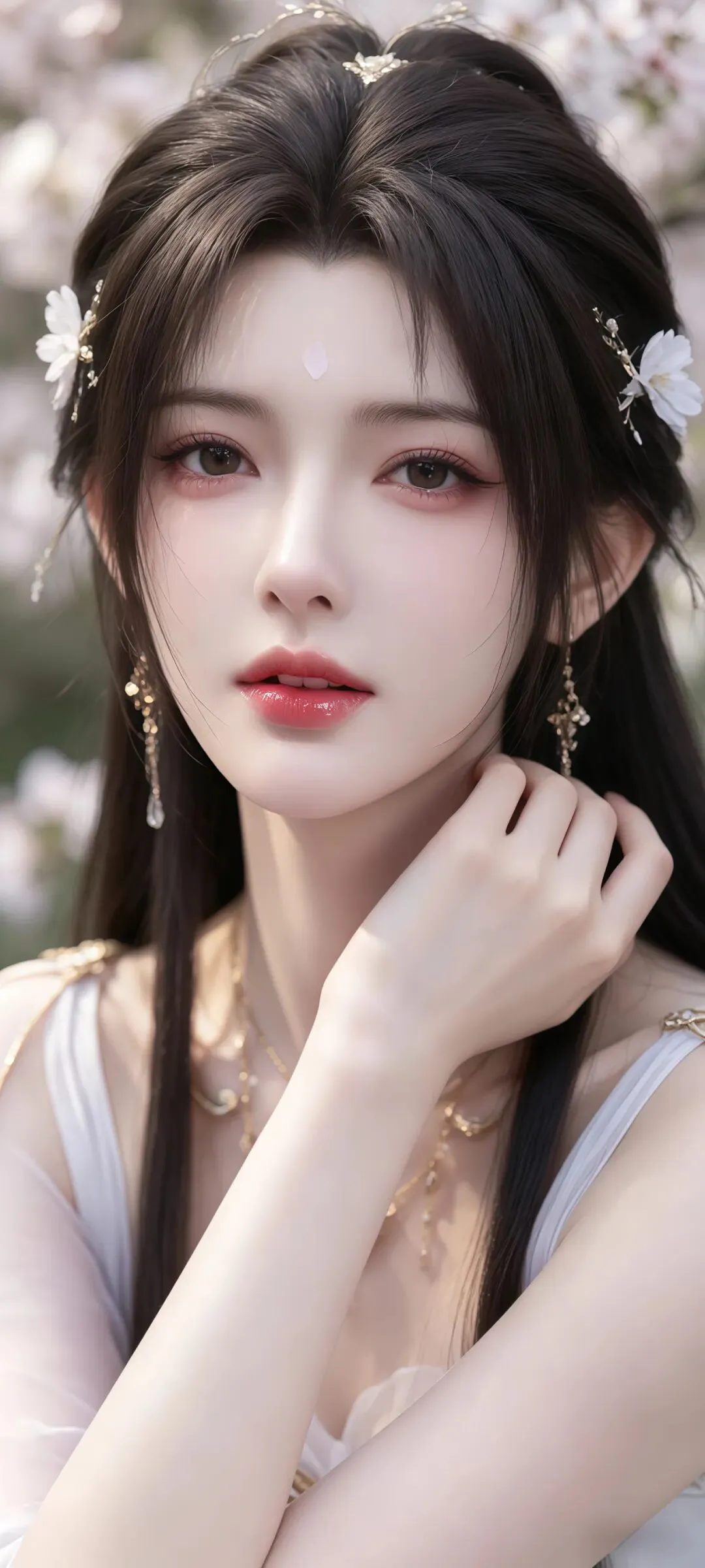 这组壁纸能被奉为颜值天花板,核心就在于对清漪五官与神态的极致刻画,在超清画质的加持下,做到了纤毫毕现、神韵兼备。创作者精准还原了清漪最具辨识度的面部特质:骨相清隽流畅,柔和的瓜子脸轮廓清晰,下颌线利落却不凌厉,既保留了少女的娇俏温婉,又暗藏着修士的锋芒与仙子的端庄。一双清眸如寒潭映月,眼尾微微上挑却不带半分媚意,只余一身傲骨与疏离,眼底流转的月华清辉里,藏着不卑不亢的道心,也藏着独有的温柔与深情,根根分明的睫毛在光影下投出浅浅的阴影,将那份清冷与破碎的反差感拉到极致。肌肤莹润如玉,泛着淡淡的月华光泽,细腻到近乎真实的质感,彻底摆脱了磨皮过度的假面感。三千青丝如瀑,半束的发髻点缀着银质月形发饰,发丝的层次感与蓬松感完美呈现,每一缕发丝的光影过渡都自然流畅,风拂过发梢的动态感栩栩如生,从眉眼到发丝,每一处细节都经得起极致放大。