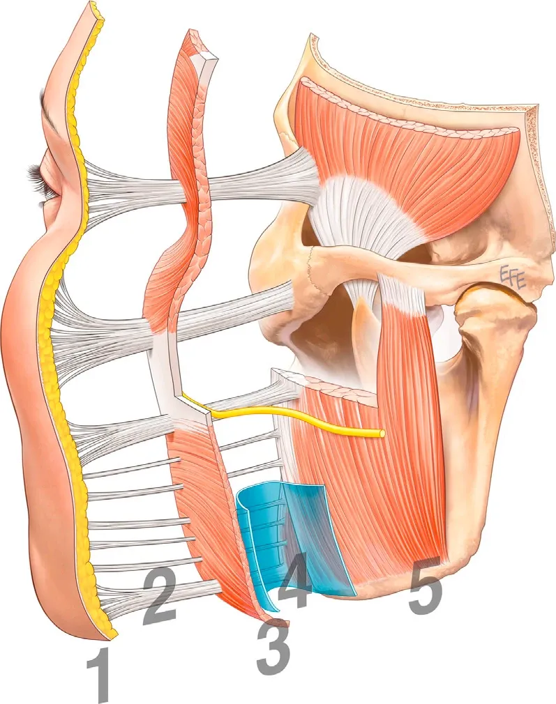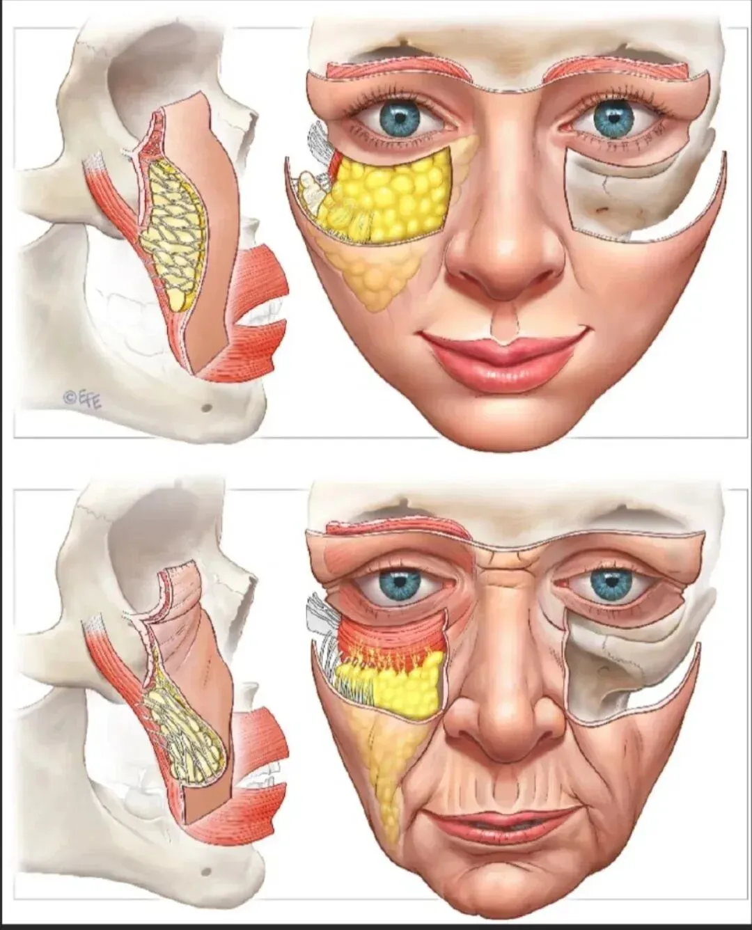 年轻时面部组织都稳定的待在原位,但随着年龄增长,面部负重不断增大,导致韧带和纤维隔松弛变长