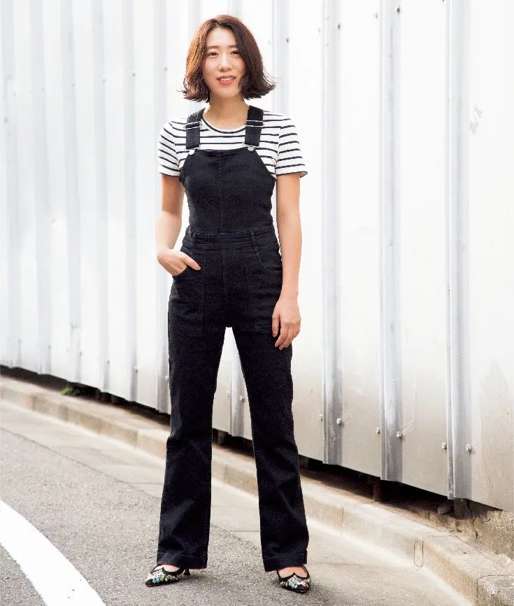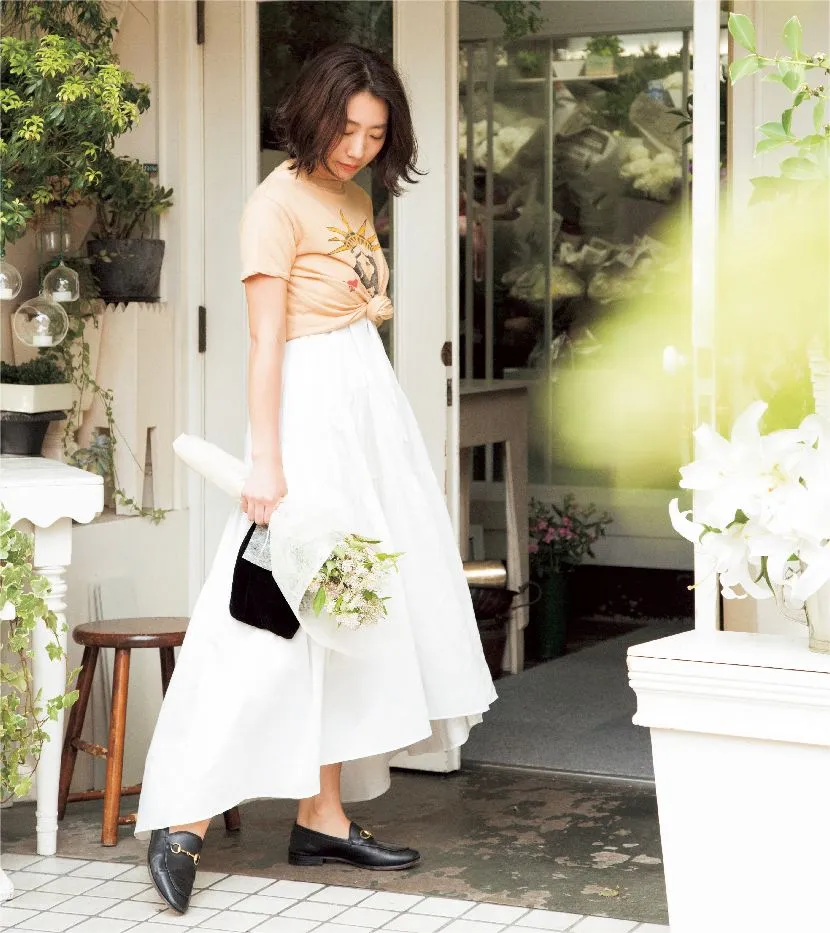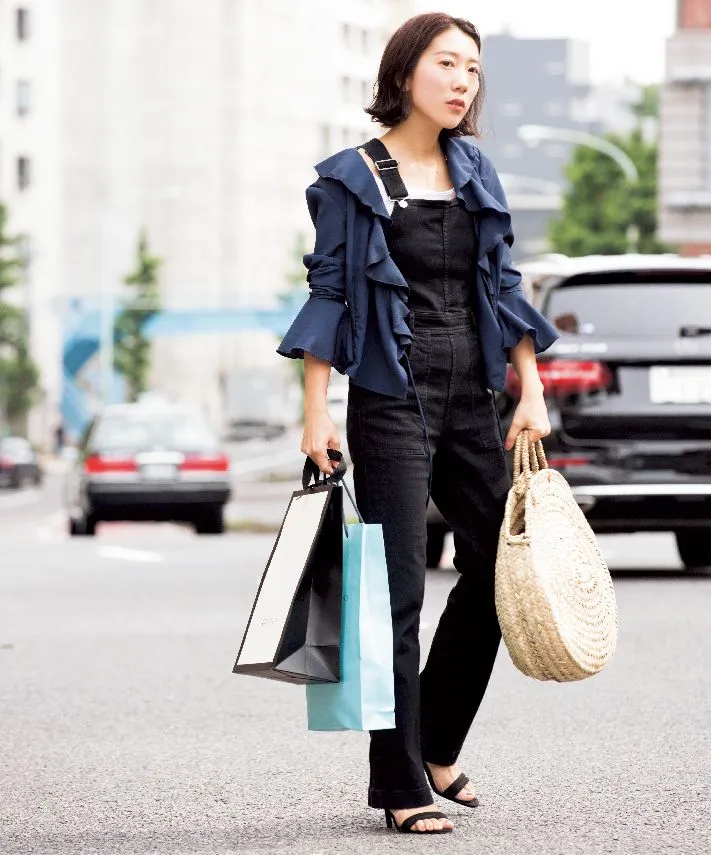一双精致的黑色便鞋则与上衣巧妙呼应,
