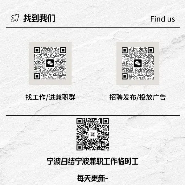 欢迎关注“宁波工作速招”公众号,每天发布最新宁波兼职,宁波日结工作、周结临时工、全职招聘信息!覆盖海曙区、江北区、镇海区、北仑区、鄞州区、奉化区及周边区域,为求职者与企业搭建高效桥梁,助力招聘求职需求快速匹配!
