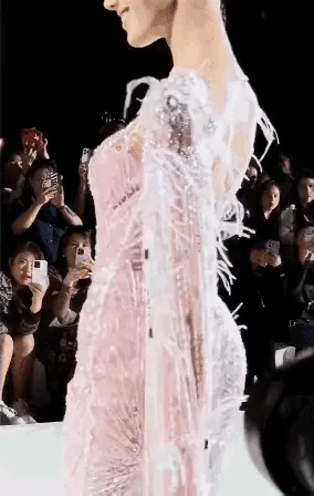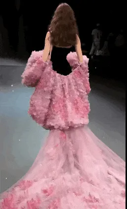 这场走秀哪是在展示衣服啊,分明是向传统审美 “宣战”!那件粉色鱼尾裙穿在 Domi 身上,不再只是块布料和剪裁的组合,倒成了她闯荡时尚圈的 “秘密武器”。温柔的粉色下,藏着一股能镇住全场的霸气;裙摆跟着她的步伐轻轻摇晃,明明年纪不大,气场却能碾压所有人。