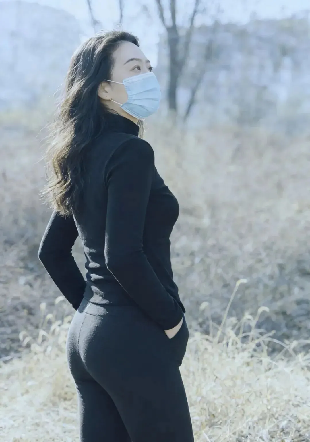 衣服选对了,姿态是加分项。好看的穿搭不单单依靠单品来完成,还要有一股宽松的感觉。小姐姐一头黑色卷发自然下垂,浅蓝色口罩后面透着一种距离感。她就坐在枯草地上边吃早餐边看电视。左腿轻轻屈起,右腿搭在上面,手臂自然下垂,没有做作。