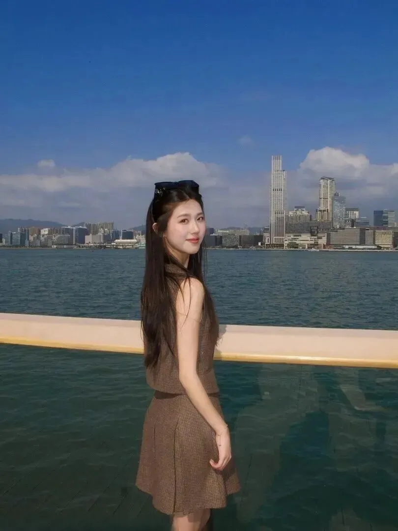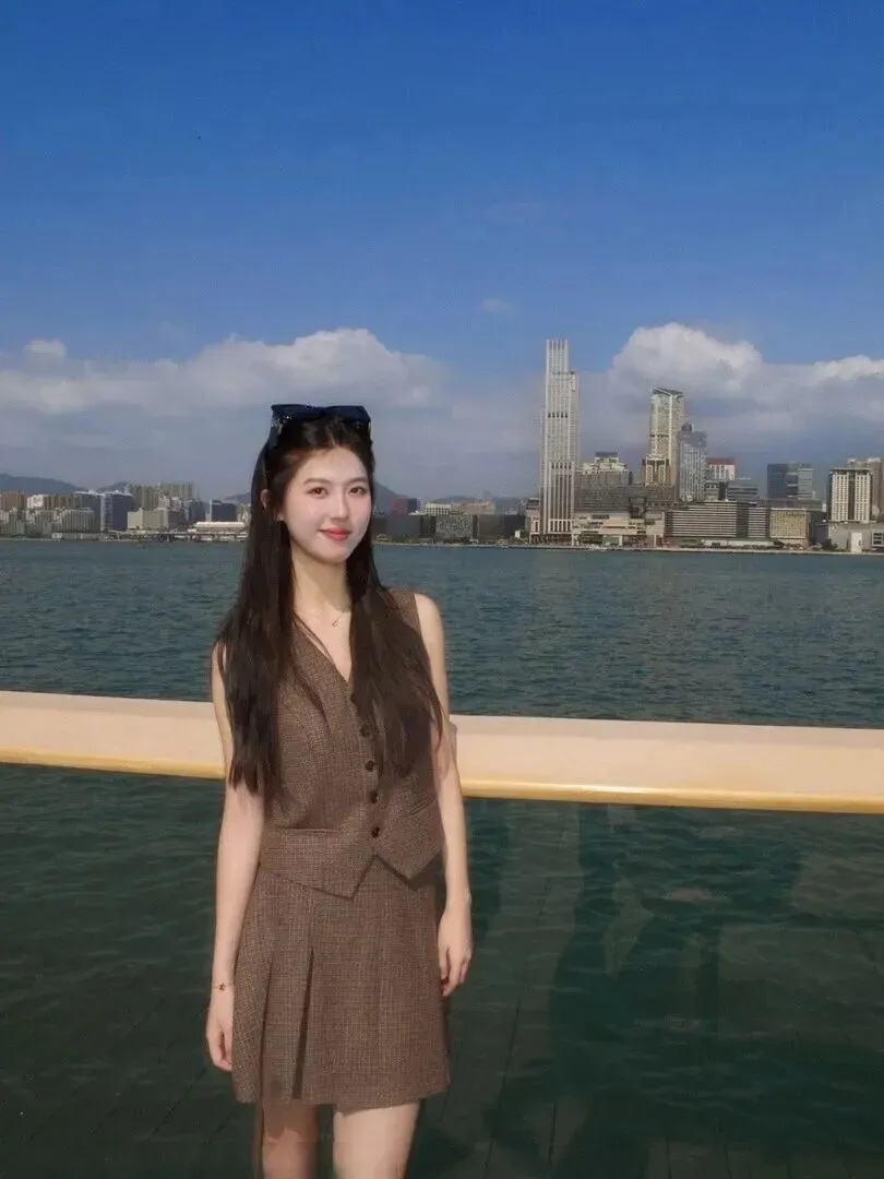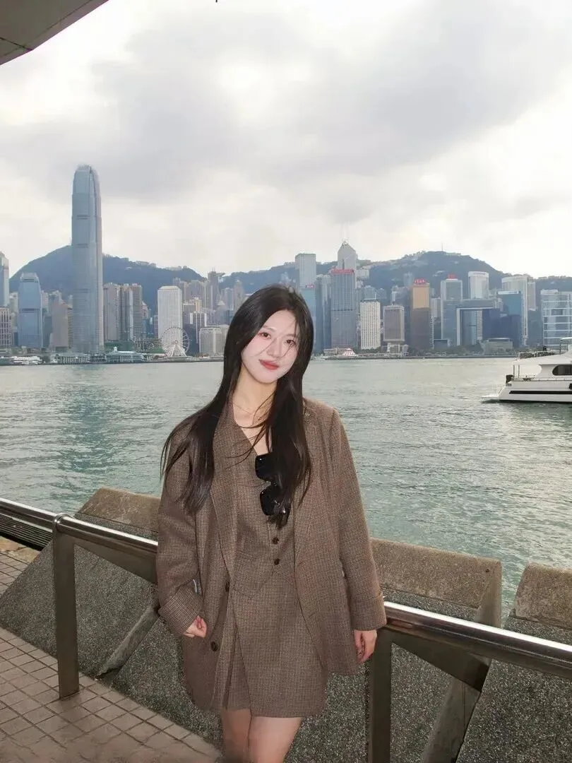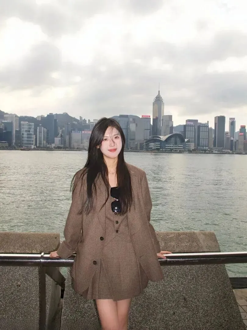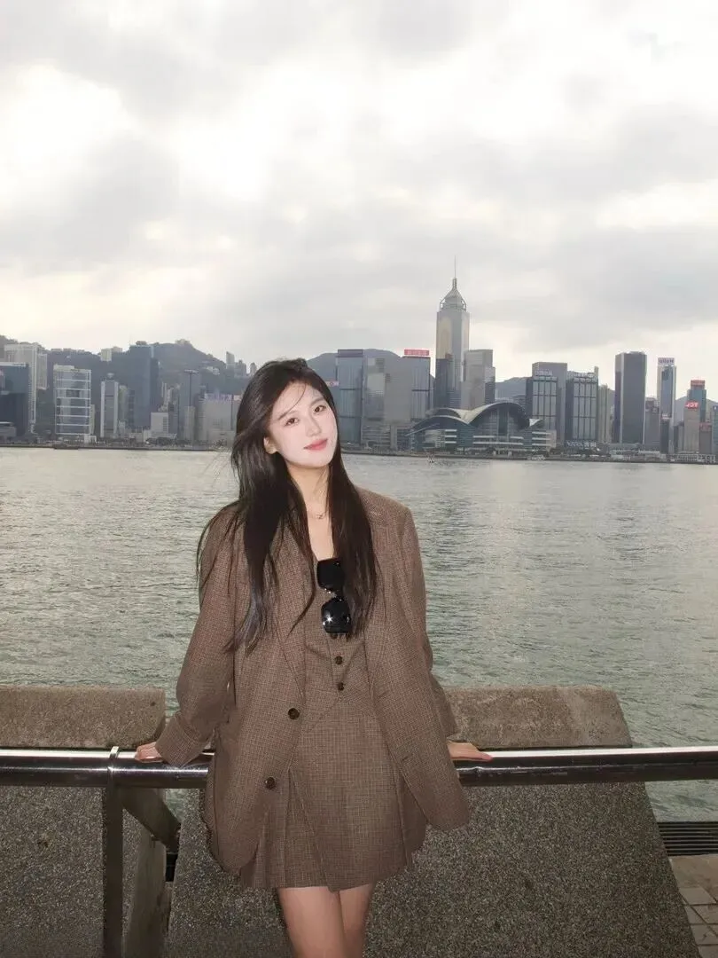 周五又穿上了灰黑色的西装,有种清冷的高级感。宽松外套加马甲+短裙+墨镜,很带感。阴天之时,她就站在水边,高楼大厦作陪衬,显得十分神秘,气质非凡。