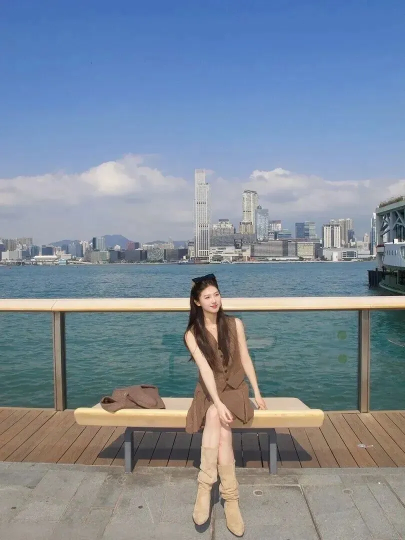 周四衣服更轻盈一点。棕色无袖针织套头衫配V领马甲+短裙的穿着方式,脚蹬麂皮短靴,外露小腿。头上的黑蝴蝶结发带很俏皮。她坐在长凳上,背后是城市的水景,这件衣服非常适合周末的放松,在逛街喝咖啡的时候也很棒。