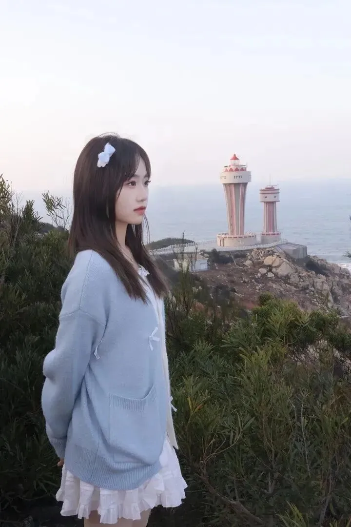首先对海边浪漫风进行介绍。穿上一件浅湖蓝开衫在海风中走过去时,是否就会使人心动呢?这件开衫手感十分柔软,右侧下摆处还有一个小小的白色蝴蝶结,细节部分也做得非常好。里面穿白色蕾丝短裙,脚蹬米色马丁靴,甜中有酷。坐在海边的岩石上,任由风儿吹拂我的长发与裙子,身后是矗立着的红、白色的灯塔,随意的一张脸照出来的,都像是在拍摄一场经典的韩剧女主镜头,非常具有韩剧女主角范!非常符合约会或周末休闲散步的时候使用,清新的同时又有个性。