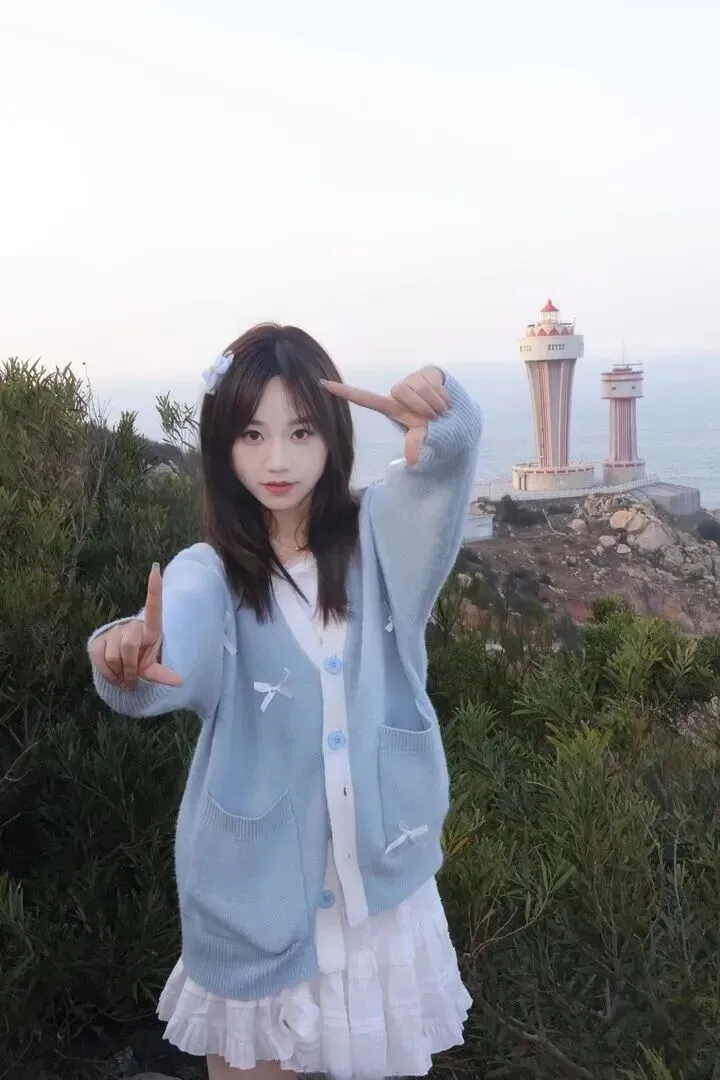 第三种就是用小精灵鬼马风,适合给活泼可爱的宝子打造!淡蓝色V领开衫配白色短裙,出景框的时候用手势动作加蝴蝶结发饰一起出现,整体造型和谐又充满活力。背景是海边塔楼,晴天拍摄自带滤镜,甜酷女孩必戴装备。该套服装穿着可以给人带来活力感,适用于出游或者聚会,能引起人们的注意。
