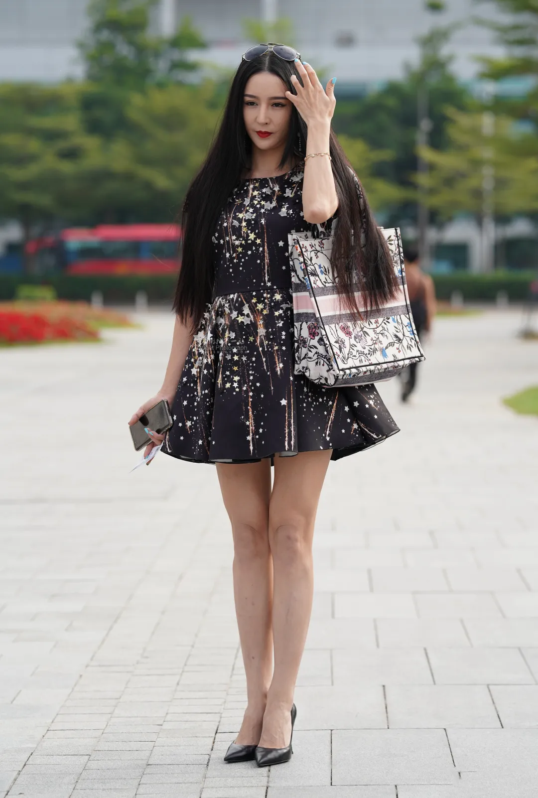 美女这身靓丽的连衣裙搭配一双个性十足的尖尖高跟鞋,轻松秀出苗条好身材,尽显优雅女神范儿。