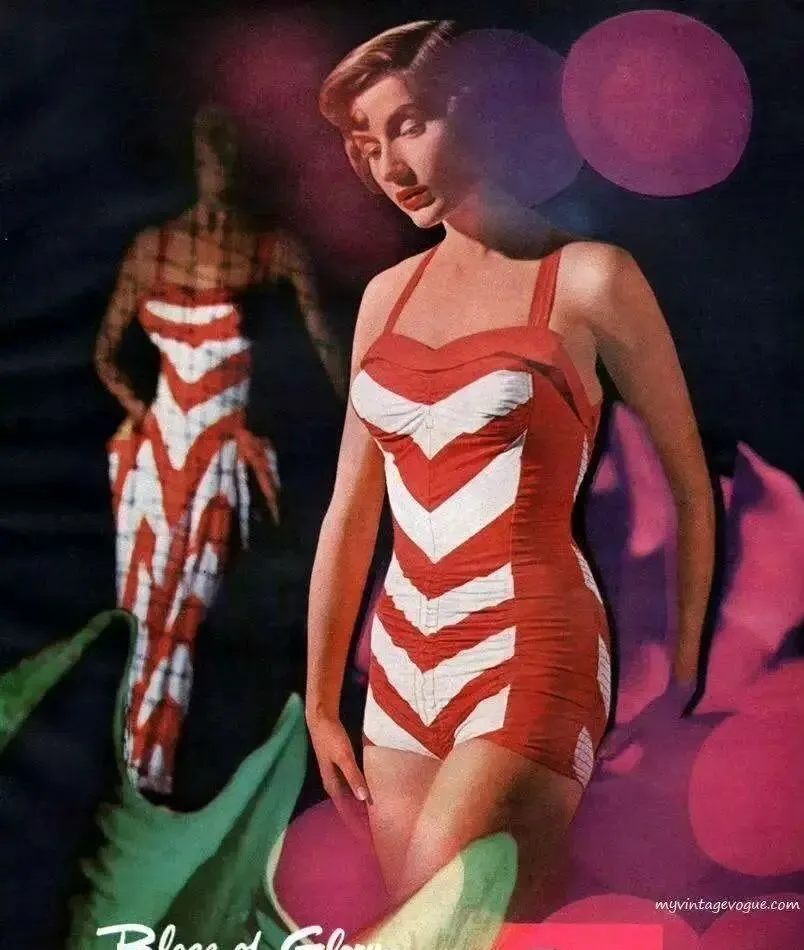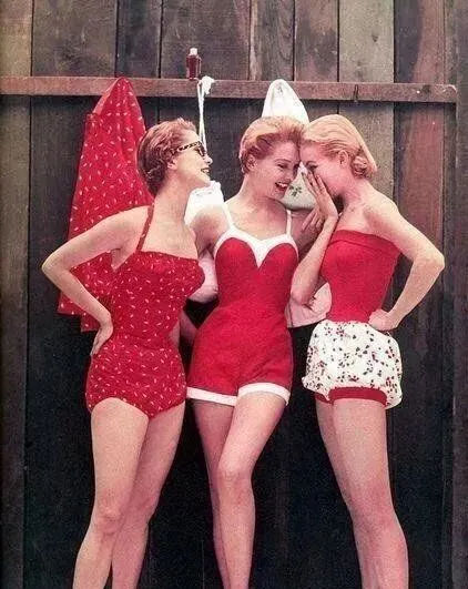 图中这三位姑娘穿的就是五十年代招牌红白撞色连体泳衣,左边这套是小红点加高腰设计,肩带刚好卡住锁骨的位置,一副乖巧利落的劲儿,正中间那个胸口是白V边装饰,显不出多少身段,却遮得恰到好处,右边这一件白底红花,收腰外加蓬松裤脚,别说现在泳池里,老照片里都少见这种小心思堆出来的花边造型,坐池边一聊就能聊半天,没谁比谁差,穿上不会担心得走光,舒服得很,那年代的剪裁就是把体面和小心机打包卖给你。