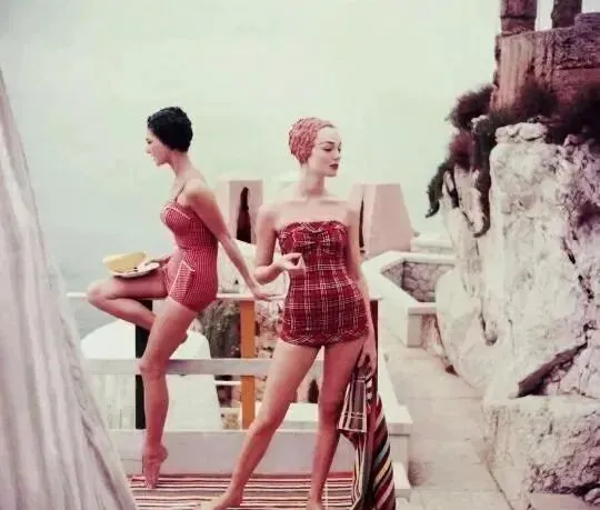 大理石做的海马墙前面,三人组一个比一个养眼,右侧条纹连体最简洁,左边黑底花泳衣显腿长,中间的绿白拼色腰线切得明晃晃,人的曲线比如今一众省布料的款式还要显,站在那里像是画报翻出来,不管什么时候,青春和阳光一碰头都能出气场,海风一吹裙摆乱,姑娘们脚边留下的就是五十年代专属的味道。