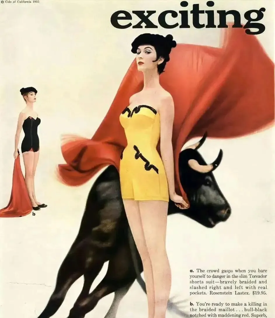谁说泳衣只能乖乖本分,这一件泳衣直接上了斗牛士舞台,黄色主色打底,黑色流曲勾边,裹胸包臀,前面还敢玩点波浪弧度,背景牛皮鼓一敲就能跳的感觉,另一边黑色小短裤和斗篷摆手,拍广告能成门面担当,奶奶看完照片还说,这衣服穿去饭馆都不像下水用的,怪有格调,她一句话带过去,“以前讲究个讲究,就是得让人看着新鲜。”