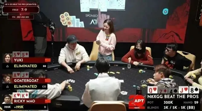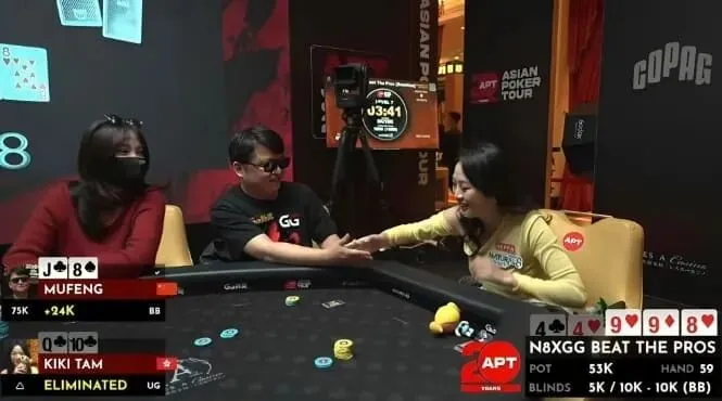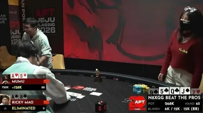 比赛开打约50分钟后迎来首个淘汰,范植威拿到AQo翻前全下,公共牌发出K-Q-9-J-2,不敌木枫的AKo,遗憾止步第九名,也成功解锁第一场Beat The Pros免费赛