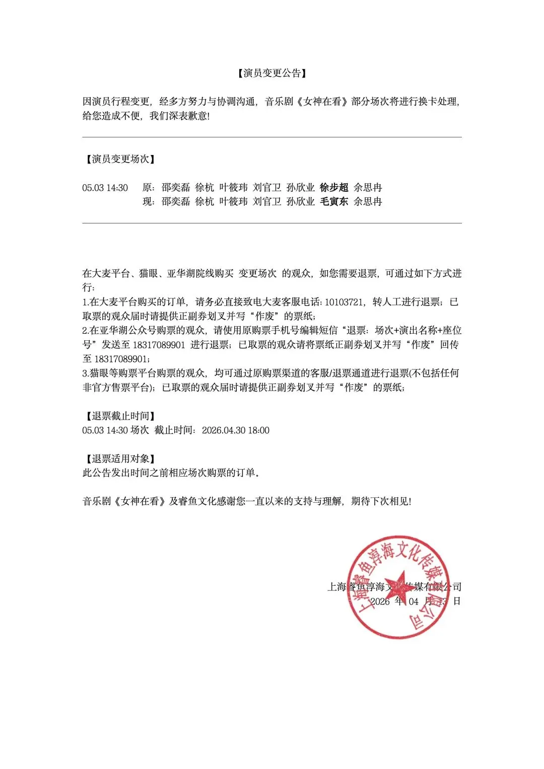【演员变更公告】