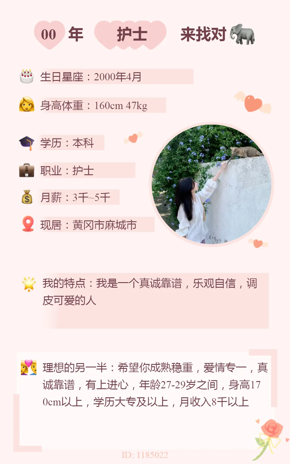 基本情况:00年,未婚,本科学历,现在麻城工作,性格乐观自信,调皮可爱,真诚靠谱!