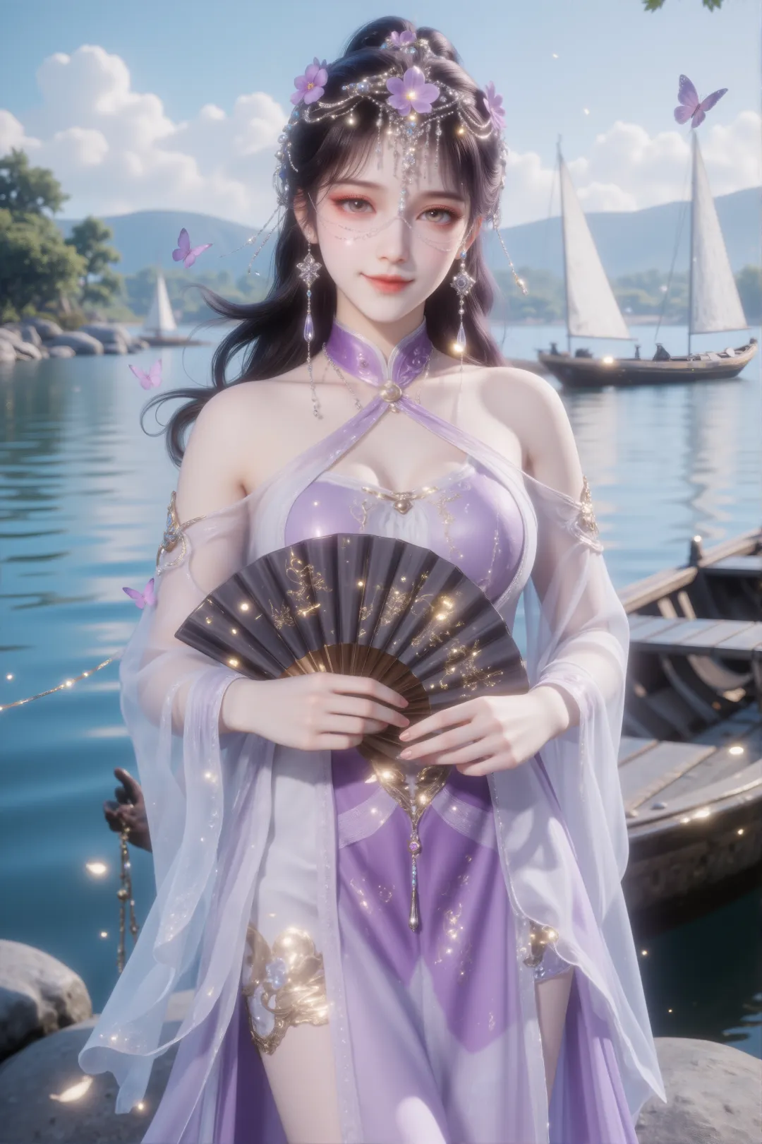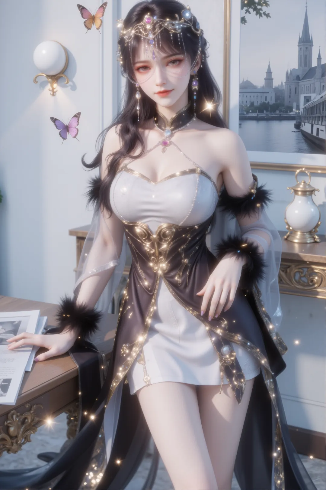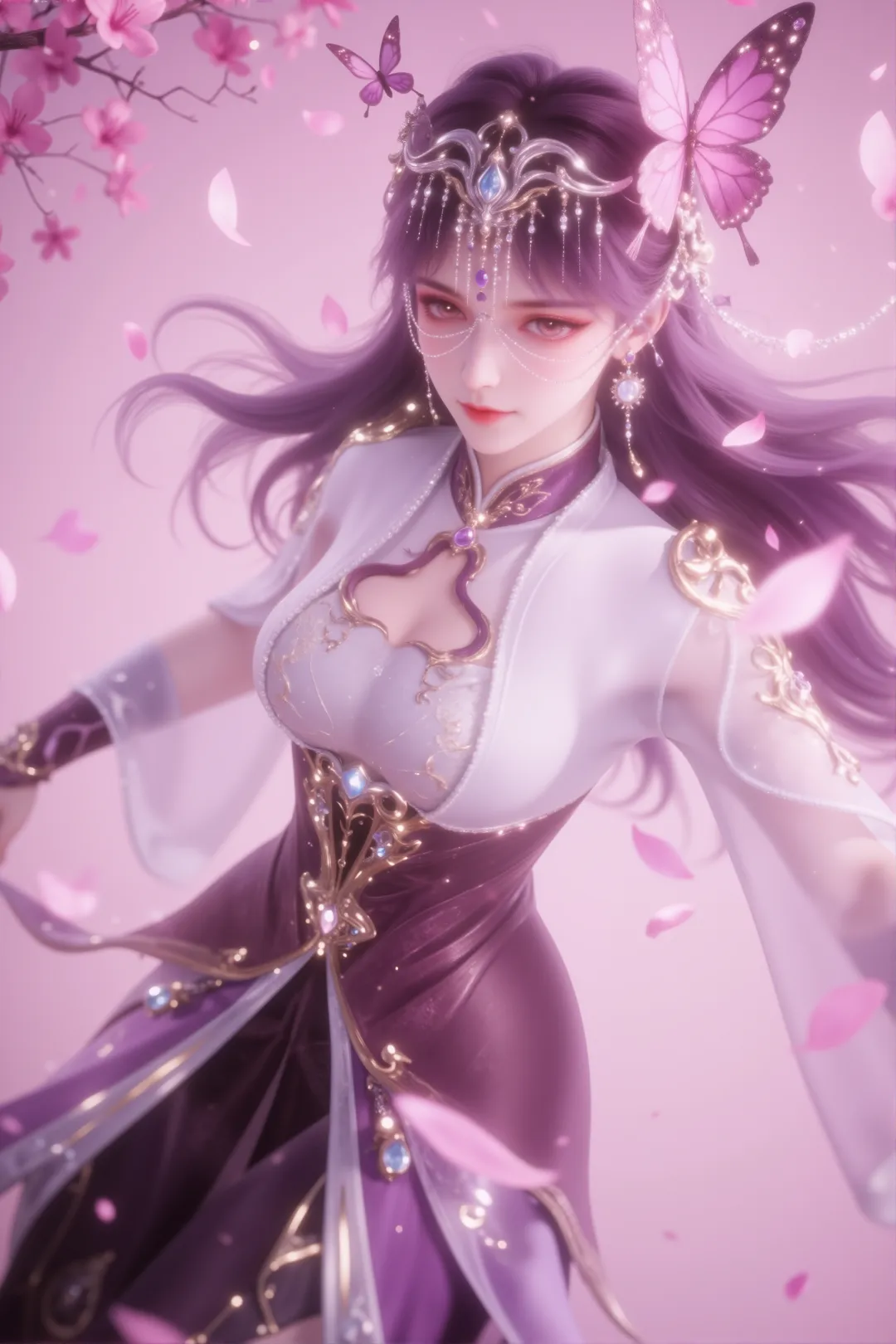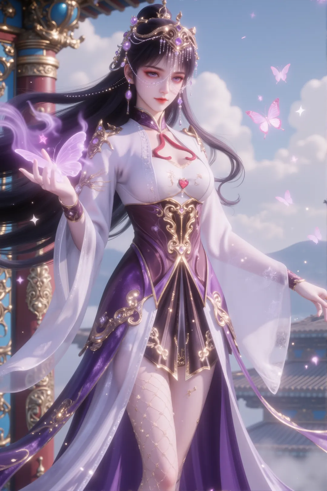 她身穿一件白色半透明长袖外衣,内搭紫色紧身胸衣,领口为中式立领并带有镂空设计,边缘饰有蕾丝与金线刺绣,腰间系着一条华丽的金色雕花腰带,中央镶嵌宝石并垂下流苏,与肩部、袖口及手腕处的金色装饰遥相呼应。下身是深紫色高开衩长裙,裙摆轻盈飘逸,材质如纱般透亮,随动作微微扬起。